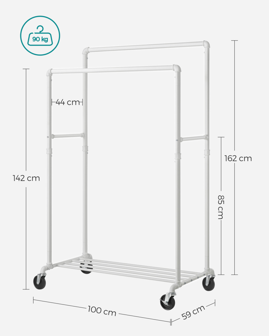A négy görgő könnyű mozgathatóságot biztosít, kettő közülük rögzíthető a biztonságos használat érdekében. A 110 kg-os teherbírás garantálja, hogy minden ruhadarab biztonságosan tárolható rajta, legyen szó akár télikabátokról vagy elegáns ruhákról.
