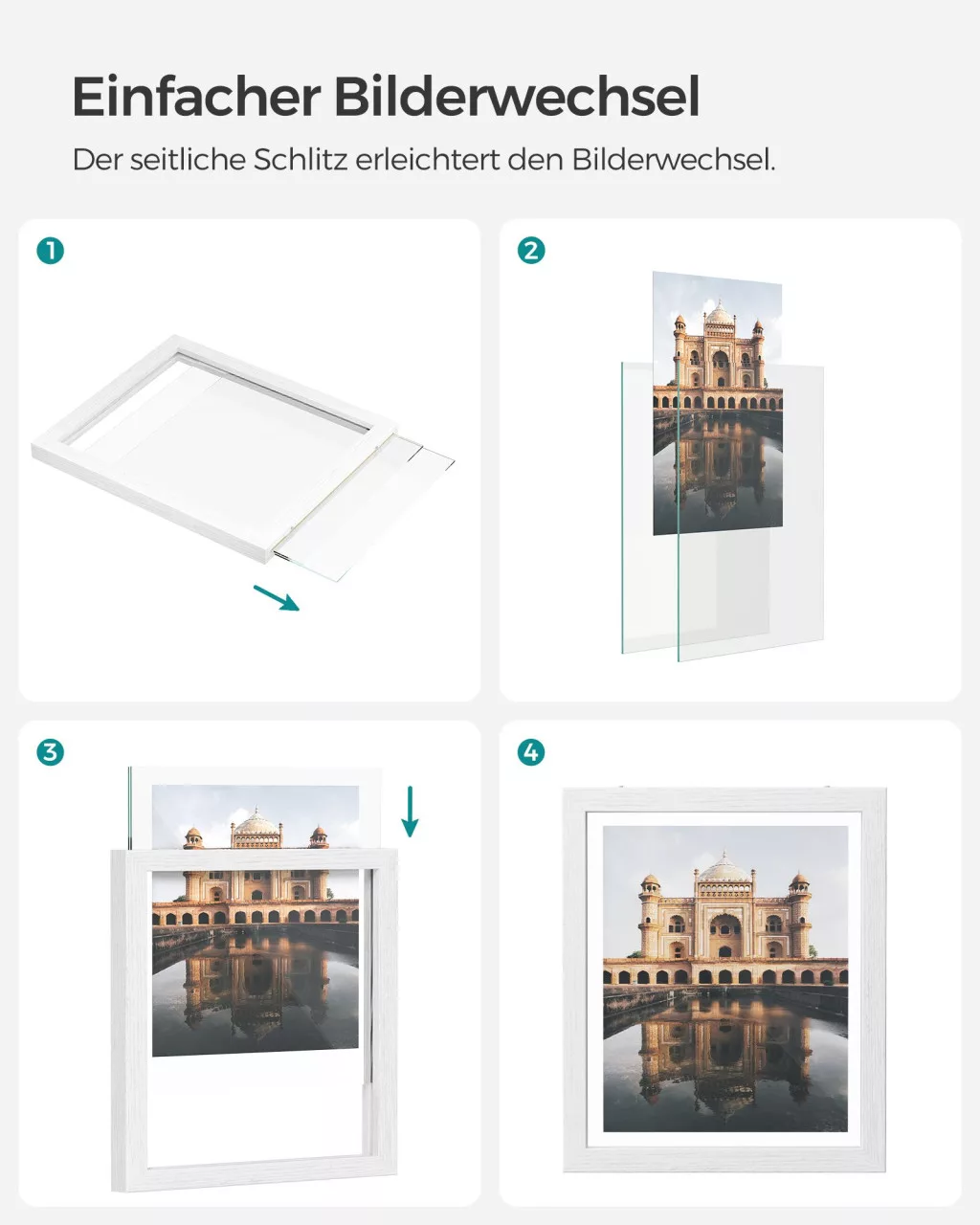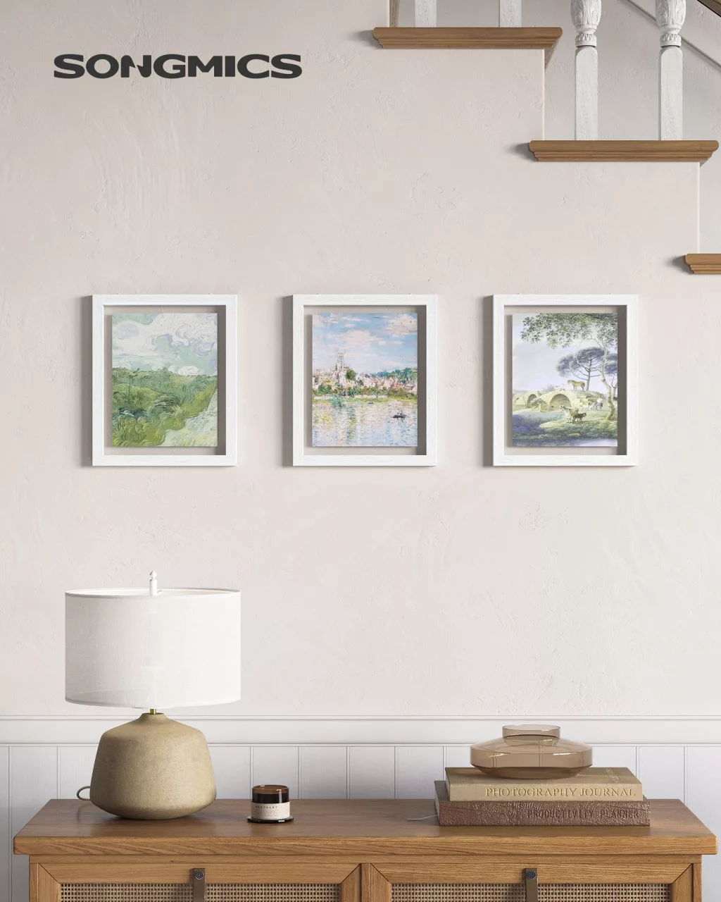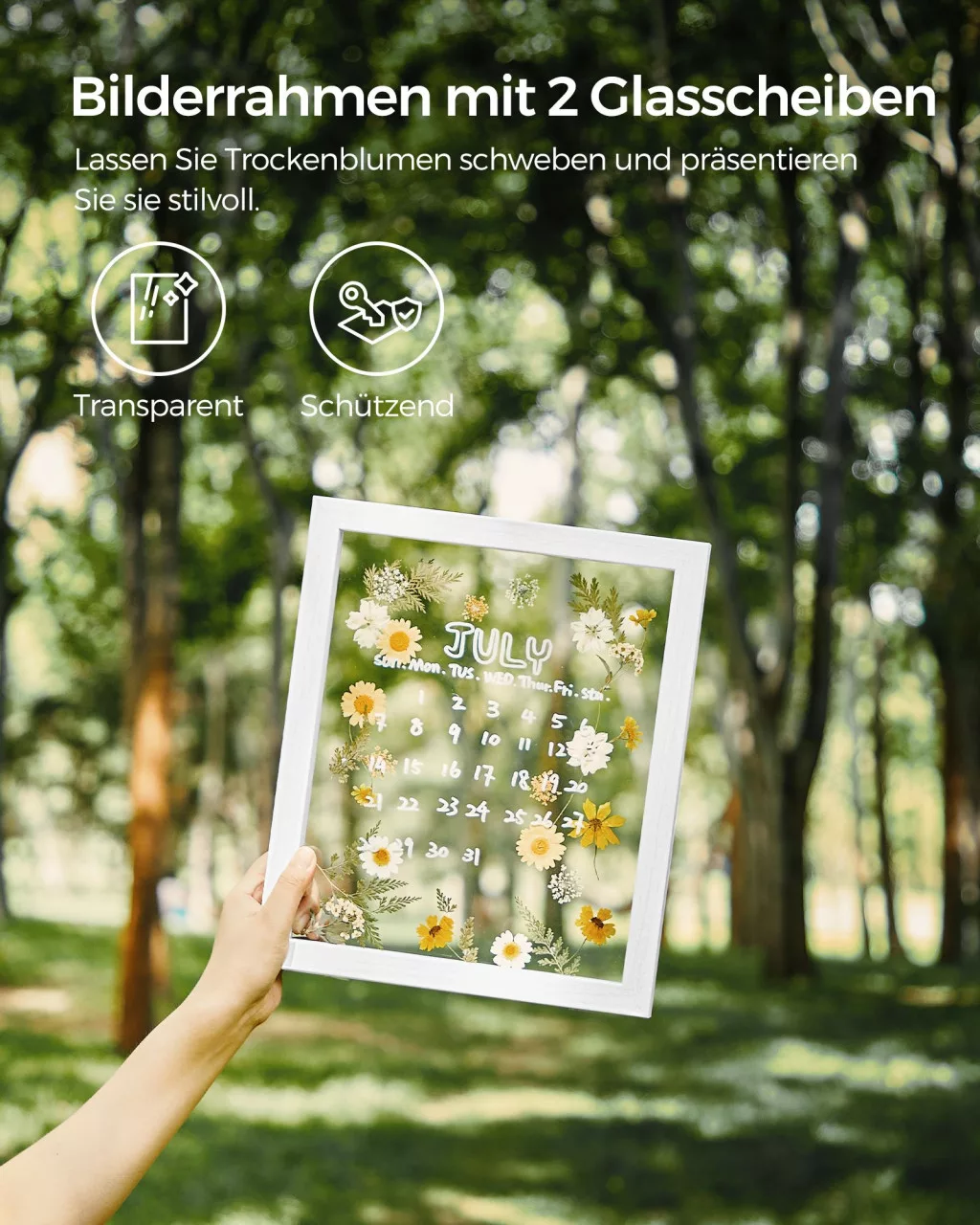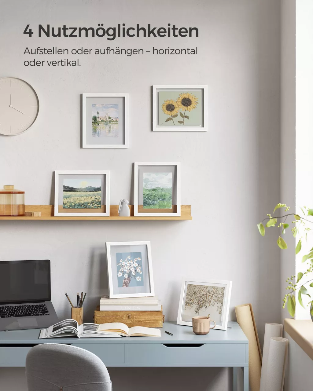 A SONGMICS dupla üveges képkeret kollekció egyesíti a funkcionalitást és az esztétikumot. A fehér MDF keretbe foglalt két üveglap között tökéletesen mutatnak a fotók, préselt virágok vagy egyéb dekorációs elemek. A keretek rugalmasan használhatók, akár állítva, akár függesztve, horizontális vagy vertikális elrendezésben.