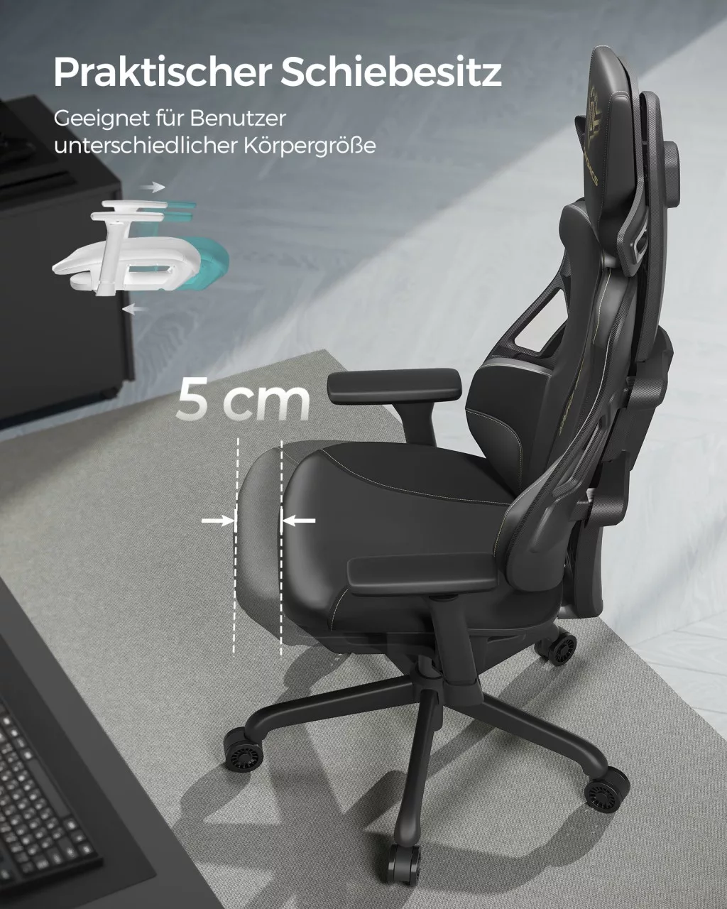 Az állítható magasságú fejtámla, a 3D kartámaszok és az állítható ülésmélység személyre szabható kényelmet biztosít minden felhasználó számára. A prémium minőségű PU borítás és a vastag párnázás hosszan tartó kényelmet garantál.