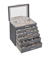 Ez az elegáns, szürke ékszertartó doboz tökéletes megoldást nyújt értékes ékszerei biztonságos és rendezett tárolására. A 6 szinten elhelyezkedő, különböző magasságú fiókok és rekeszek lehetővé teszik minden típusú ékszer megfelelő elhelyezését, a gyűrűktől kezdve a nagyobb nyakláncokig.