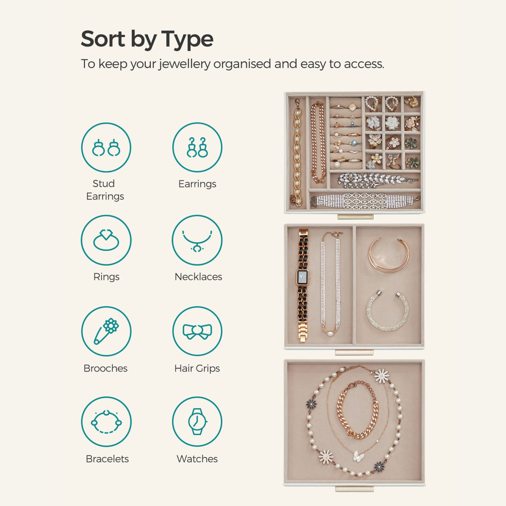 A bársonyos belső borítás és a 19 különböző méretű rekesz gondoskodik ékszerei biztonságos és rendezett tárolásáról. A két praktikus fiók további tárolóhelyet biztosít, így minden darab megtalálja a maga helyét.