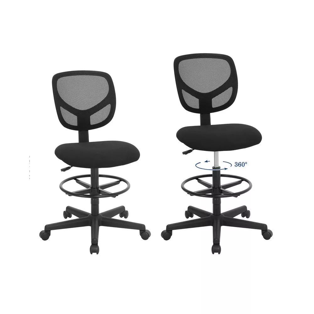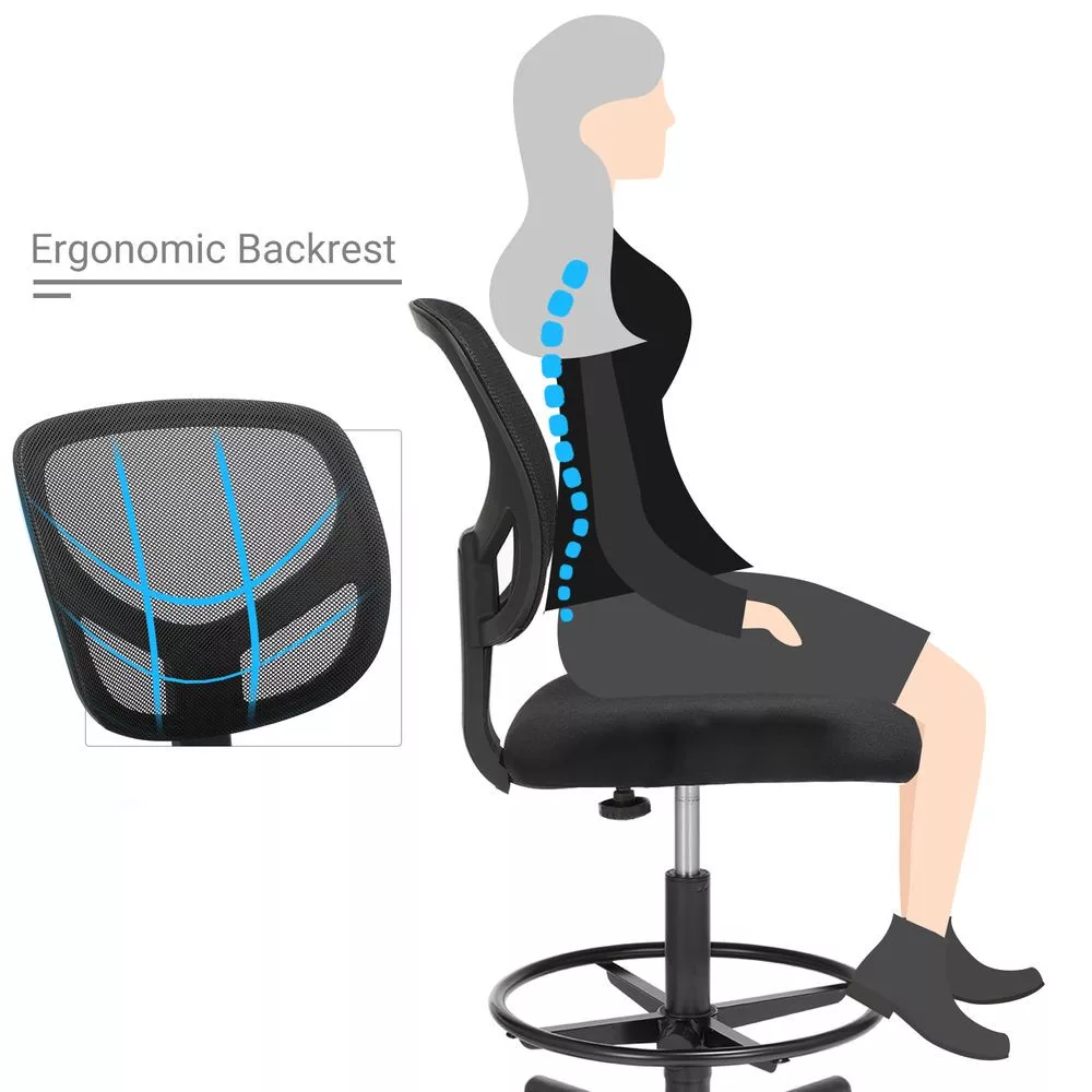 Ergonomikus kialakítású, magasított rajzszék állítható lábtartóval és hálós háttámlával, ideális otthoni irodába vagy művészeti stúdióba.