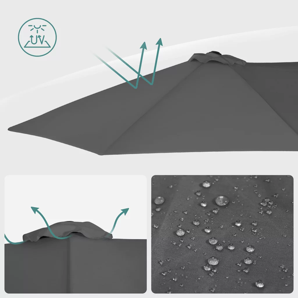 Extra nagy méretű, dupla napernyő UPF 50+ UV-védelemmel, ideális megoldás kertek, teraszok és vendéglátóhelyek árnyékolására. Strapabíró fém vázzal és tartós poliészter anyaggal.