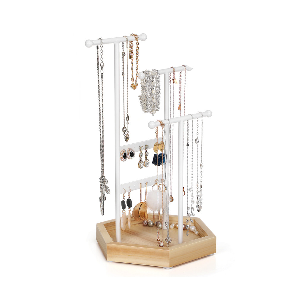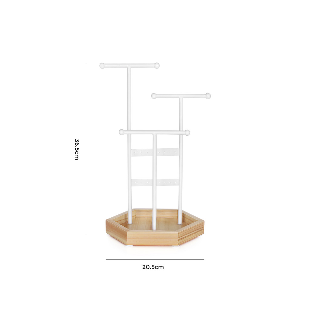 Elegáns, többszintes ékszertartó állvány fa alappal és fehér fém vázzal, amely tökéletes megoldást nyújt nyakláncok, karkötők, fülbevalók és gyűrűk rendezett tárolására.