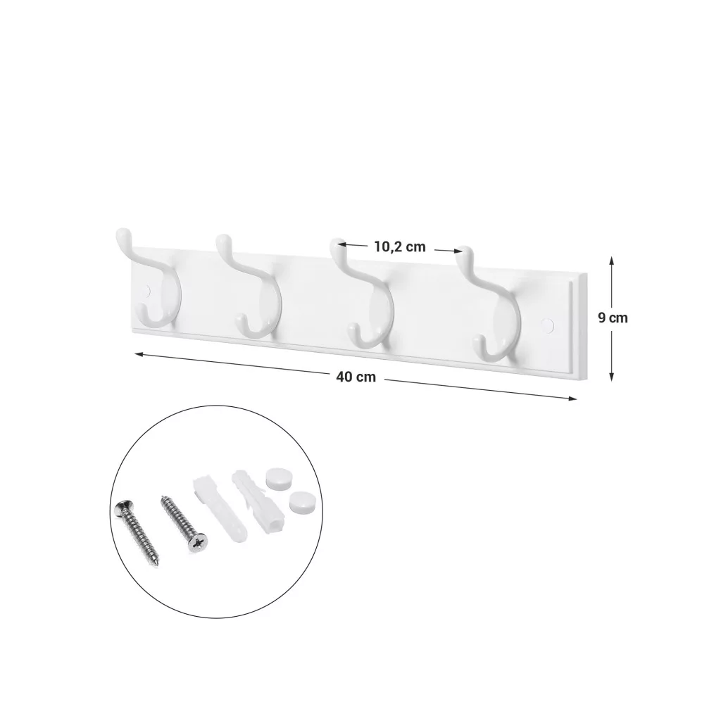 Ez a modern, fehér fali fogas tökéletes megoldást kínál a mindennapi rendszerezéshez. A 4 masszív, dupla fém akasztó biztonságosan megtartja a kabátokat, táskákat és egyéb kiegészítőket, míg az MDF alapanyag tartós és esztétikus megjelenést biztosít.