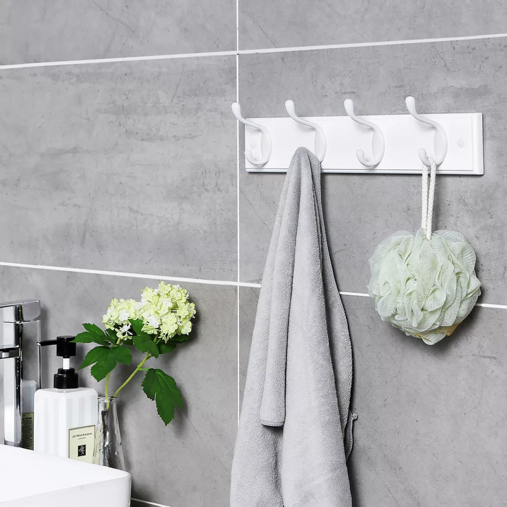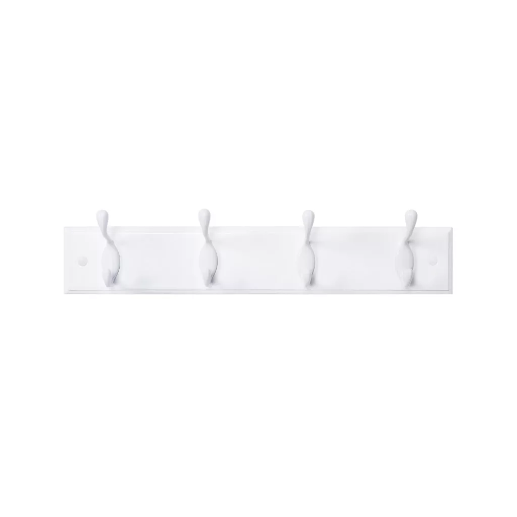 Elegáns, fehér fali fogas 4 dupla akasztóval, amely tökéletes megoldást nyújt kabátok, táskák és kiegészítők rendezett tárolására.