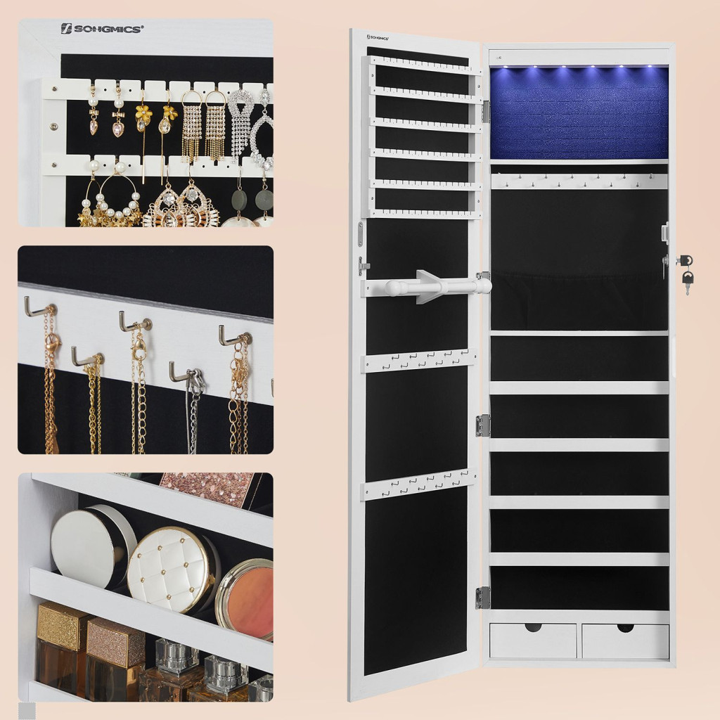 SONGMICS Falra Szerelhető Ékszertartó Szekrény LED Világítással és Tükörrel Fehér