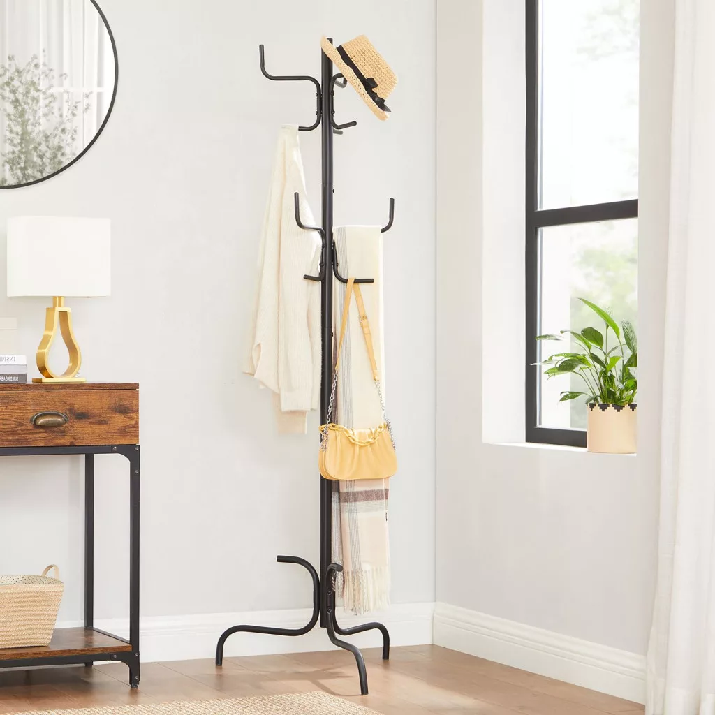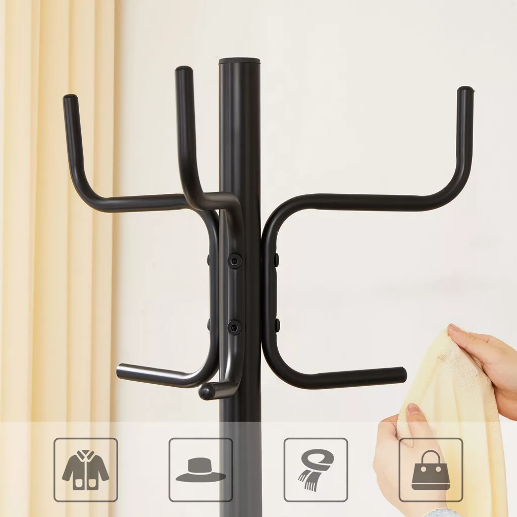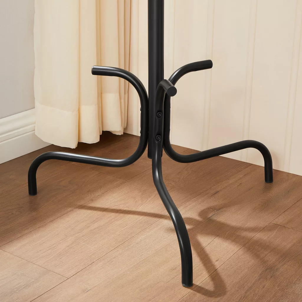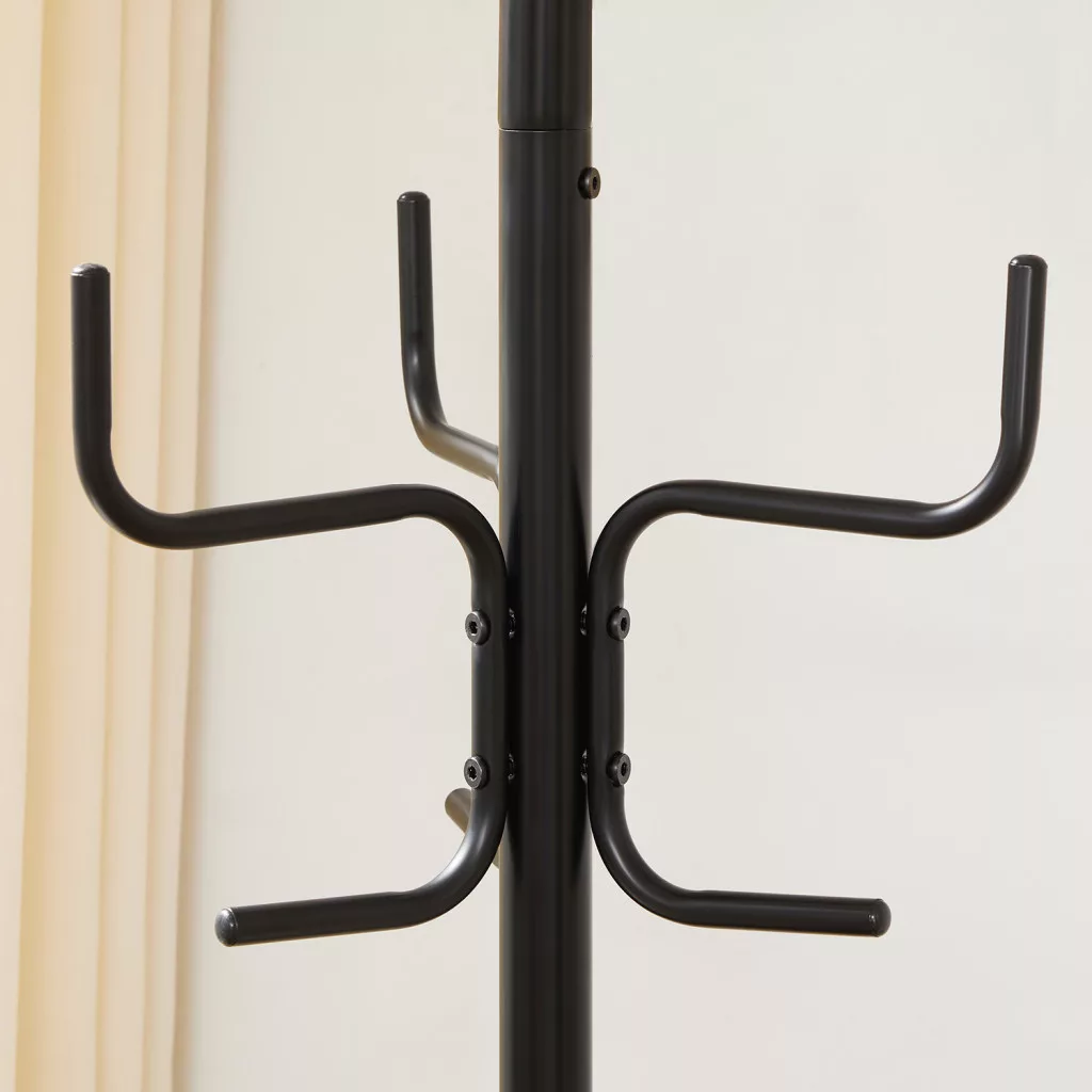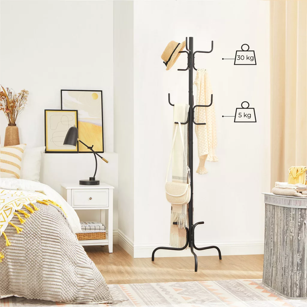 Ez a modern, fekete fém ruhafogas a tökéletes választás otthona rendezettségének megőrzéséhez. A 6 erős akasztó ideális kabátok, táskák, kalapok és egyéb kiegészítők tárolására, míg a háromszög alakú talp stabil tartást biztosít.