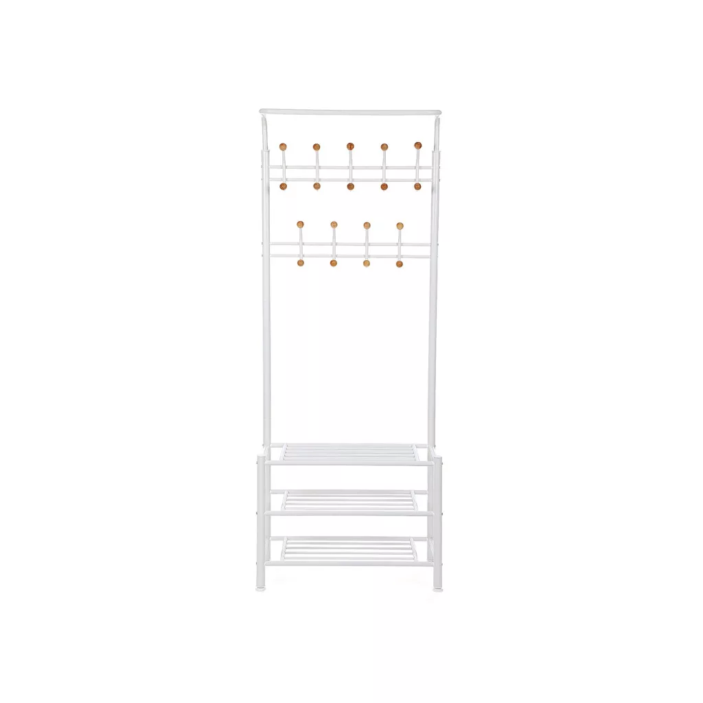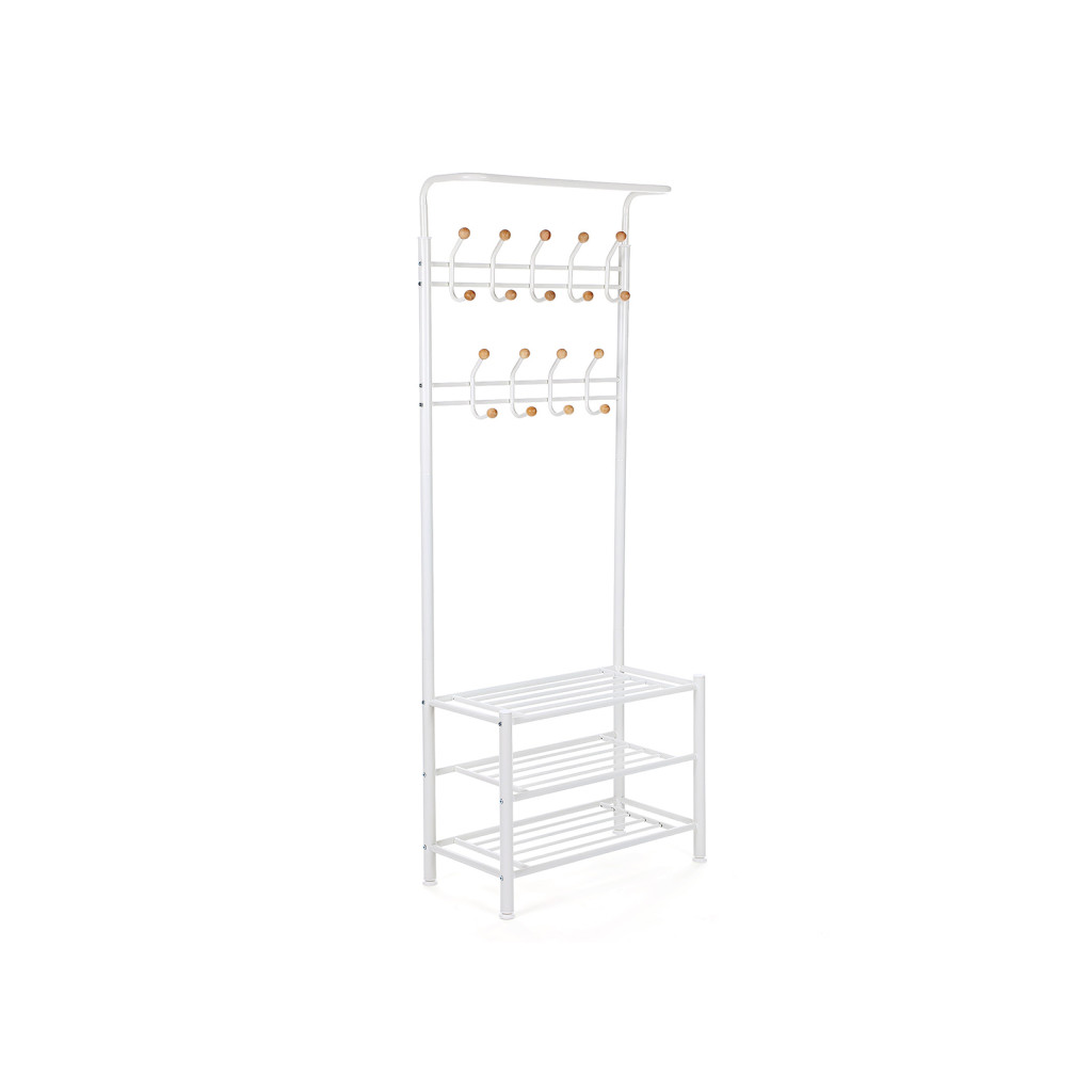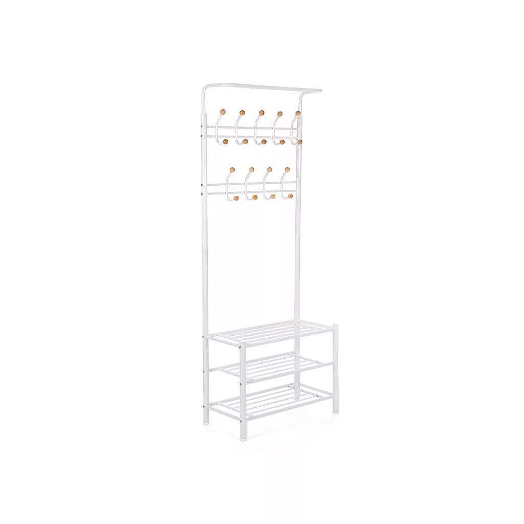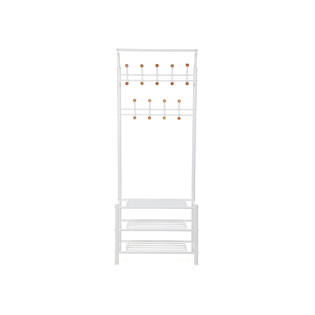 Elegáns, multifunkcionális előszobai állvány 18 akasztóval és 3 tárolópolccal, amely tökéletes megoldást nyújt kabátok, cipők és kiegészítők rendezett tárolására.