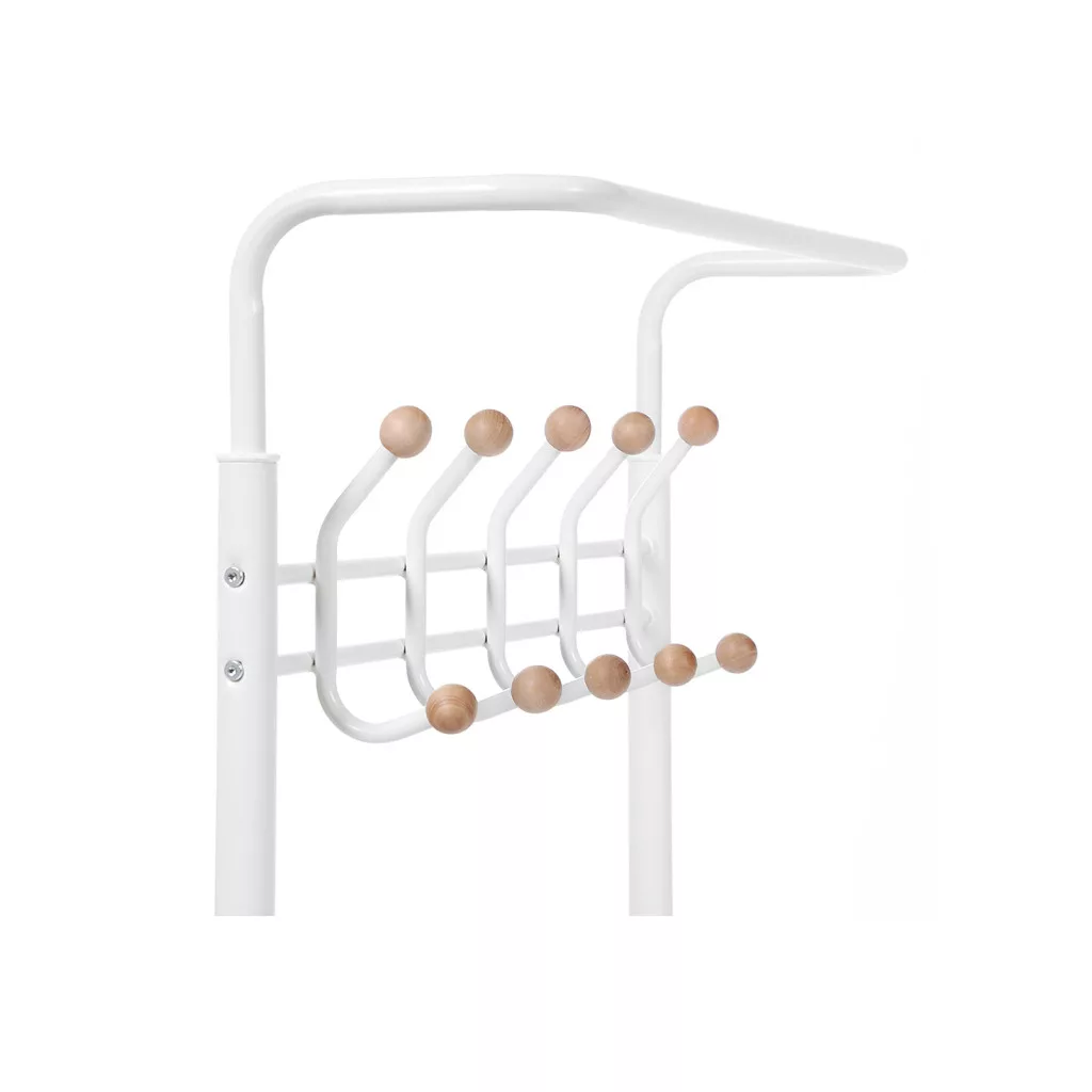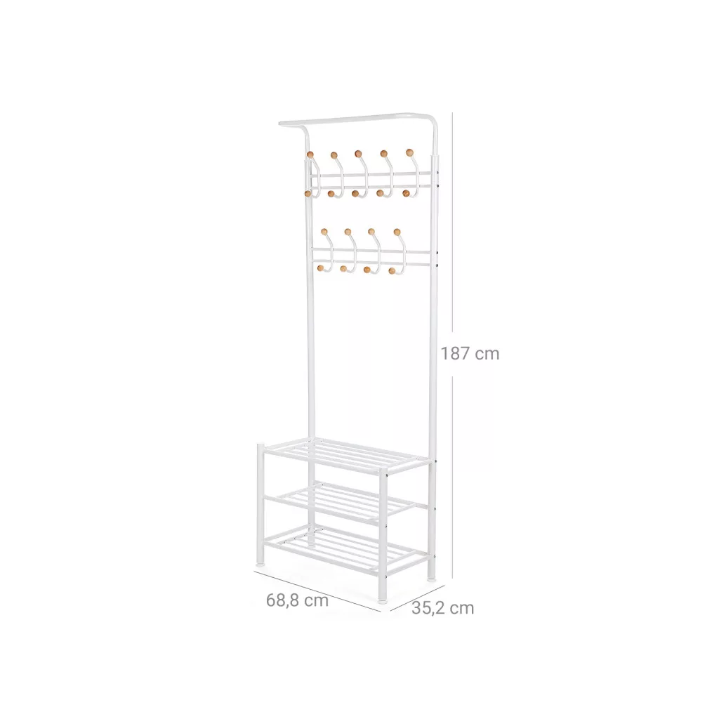 Ez a modern, fehér fém előszobai állvány praktikus megoldást kínál a mindennapi ruhadarabok és kiegészítők tárolására. A 18 strapabíró akasztó bőséges helyet biztosít kabátok, táskák és egyéb ruhadarabok számára, míg a három polc ideális cipők, dobozok és más kiegészítők elhelyezésére.