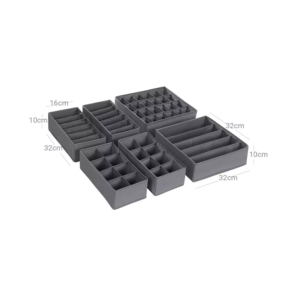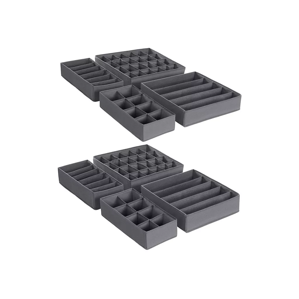 Praktikus fiókrendező szett 8 különböző méretű tárolódobozzal melltartók, zoknik, nyakkendők és sálak rendszerezett tárolásához. Tartós, szürke nemszőtt anyagból készült, összehajtható kivitelben.