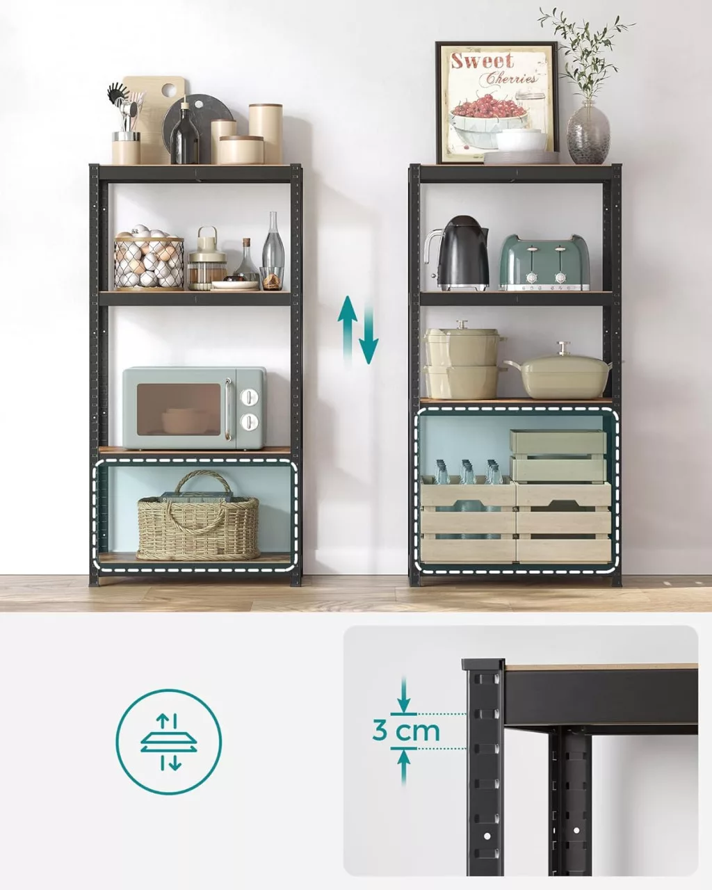 Az állvány két külön egységre osztható, így rugalmasan elhelyezhető különböző helyiségekben - például az egyik a konyhában mikrohullámú sütő és sütő tartójaként, a másik a dolgozószobában könyvek, növények és nyomtató tárolására szolgálhat. A polcok magassága állítható, így személyre szabható tárolási megoldást kínál. A slot-in csatlakozásoknak köszönhetően az összeszerelés gyors és egyszerű, míg a mellékelt fali rögzítő készlet extra stabilitást és biztonságot nyújt.