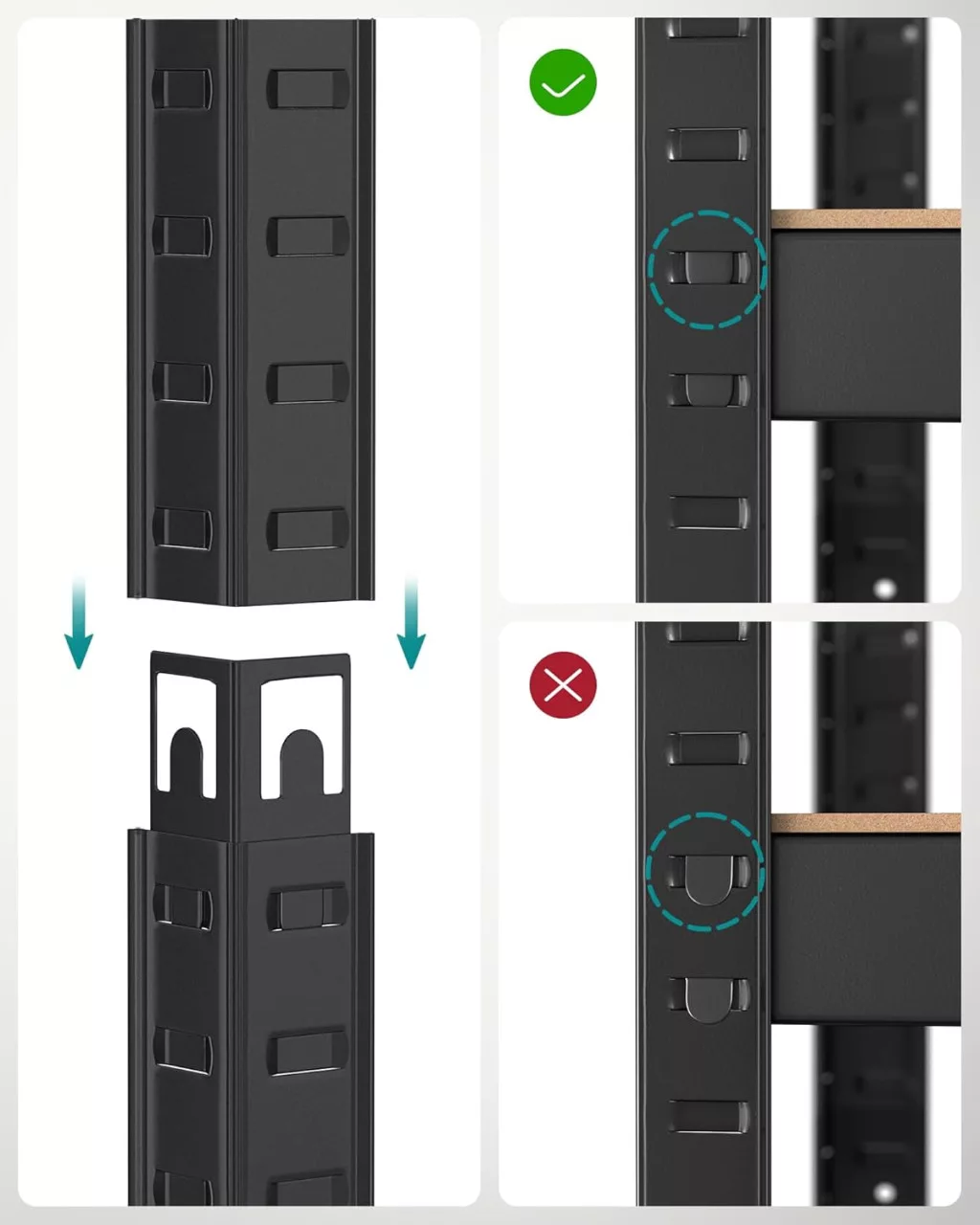 • Állítható polcmagasság és egyszerű slot-in összeszerelés, amely lehetővé teszi a gyors telepítést és a tárolási tér személyre szabását az egyéni igények szerint