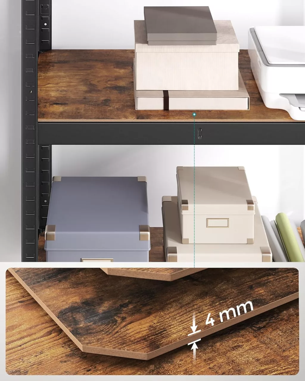 Robusztus ipari stílusú tárolóállvány 520 kg összesített teherbírással, amely tökéletes megoldást kínál a konyha, nappali, garázs vagy műhely rendszerezéséhez. A rozsdabarna fa mintázatú polcok és fekete acélváz kombinációja stílusos és praktikus tárolást biztosít.