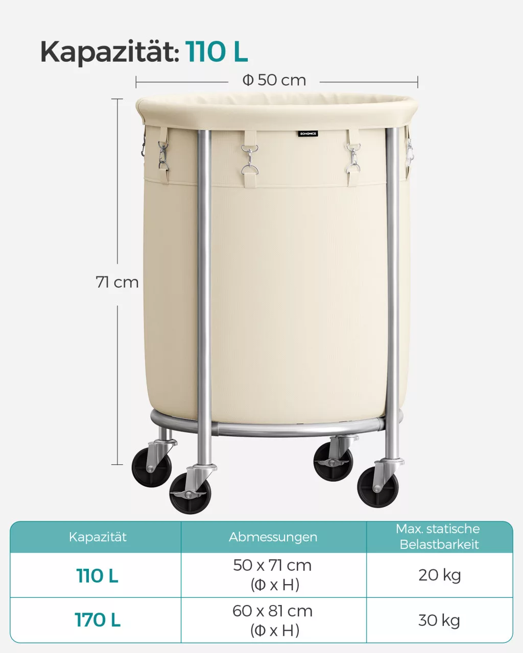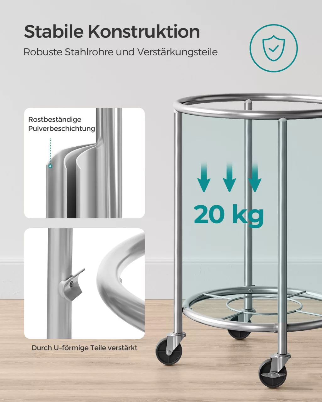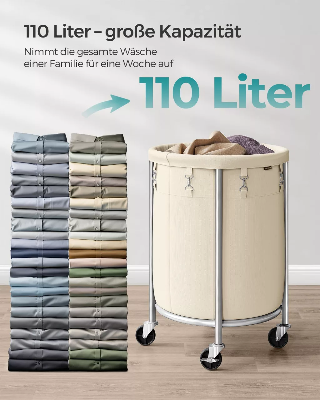 Ez a prémium minőségű, 110 literes SONGMICS szennyestartó kosár egyesíti a funkcionalitást és a tartósságot. A porszórt acélváz és a kiváló minőségű 600D poliészter anyag garantálja a hosszú élettartamot, míg a négy kerék könnyű mozgathatóságot biztosít.