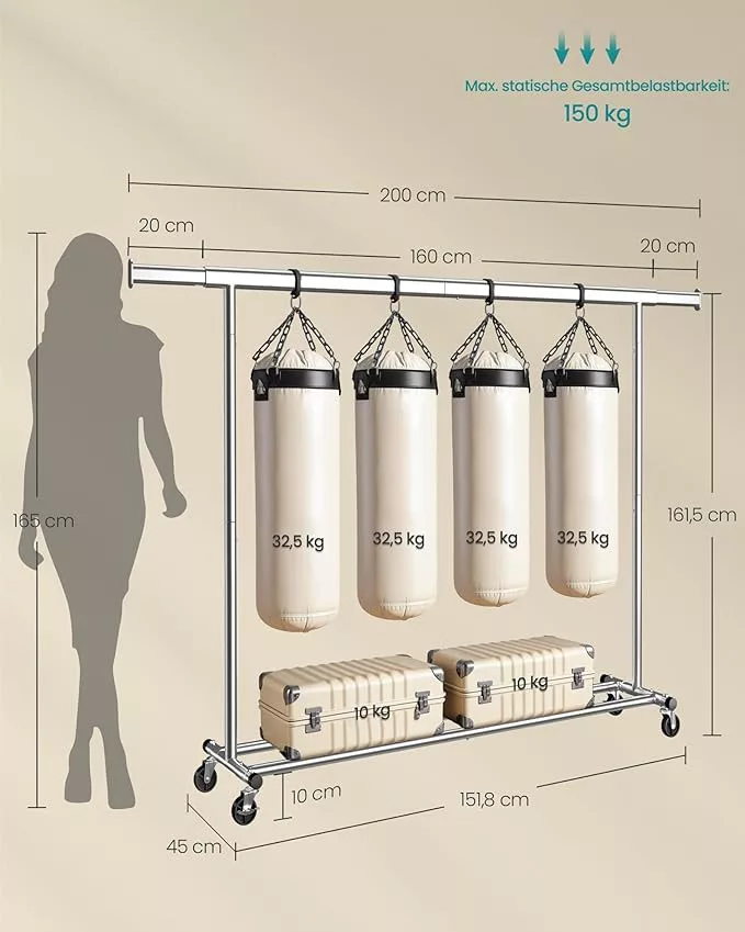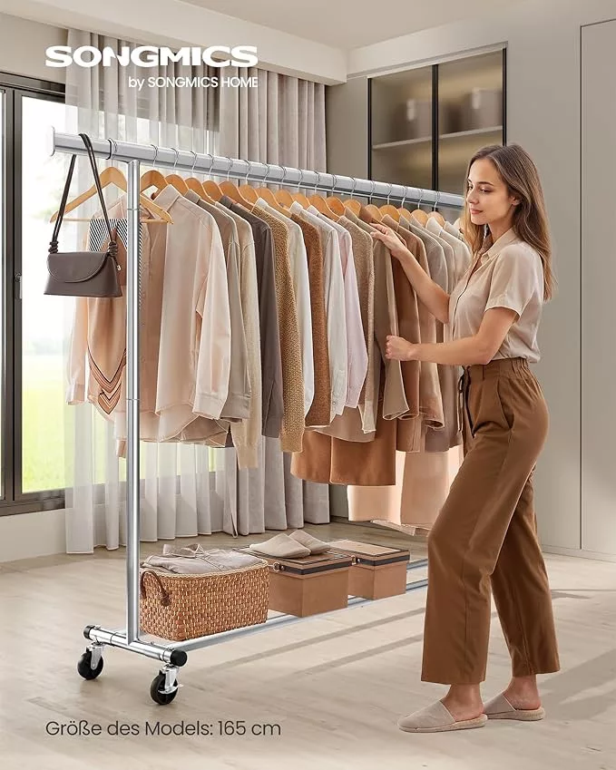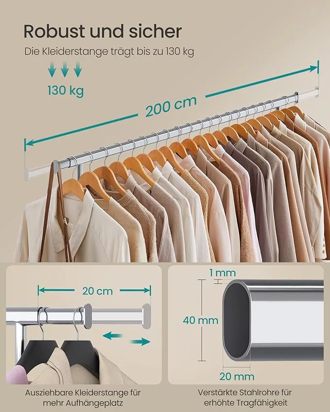 Ez a SONGMICS ruhaállvány egyesíti a robusztus kialakítást a praktikus funkcionalitással. Az 1 mm falvastagságú acélcsövek és a megerősített szerkezet kivételes, 150 kg-os teherbírást biztosít, míg a kihúzható rúd 160-200 cm között állítható a maximális tárolókapacitás érdekében.