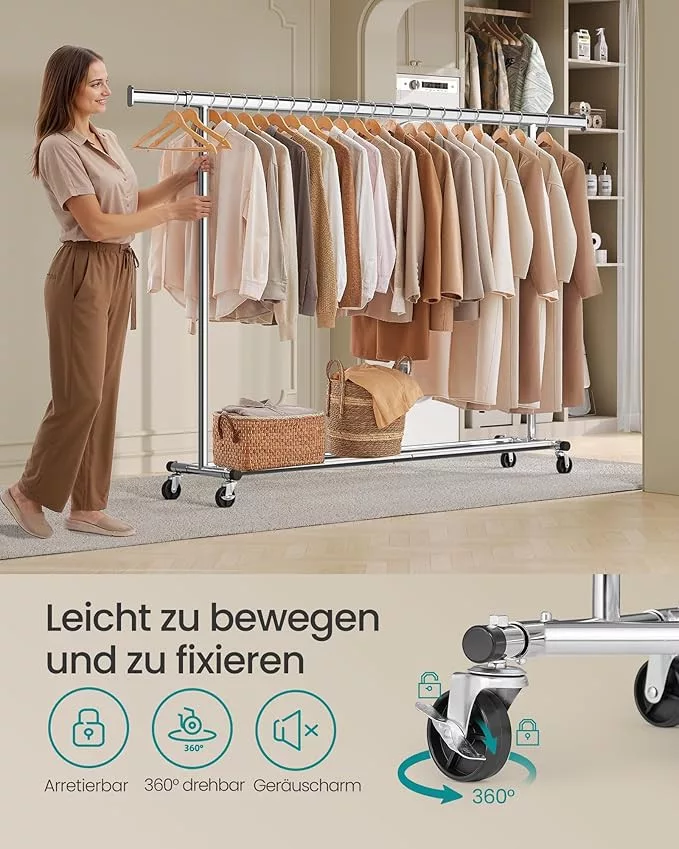 A négy 360 fokban elforduló kerék, melyből kettő fékezhető, könnyű mozgathatóságot biztosít. Az alsó polcok további tárolóhelyet kínálnak cipők, dobozok vagy kiegészítők számára, míg a krómbevonat hosszú élettartamot és elegáns megjelenést garantál.