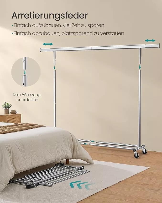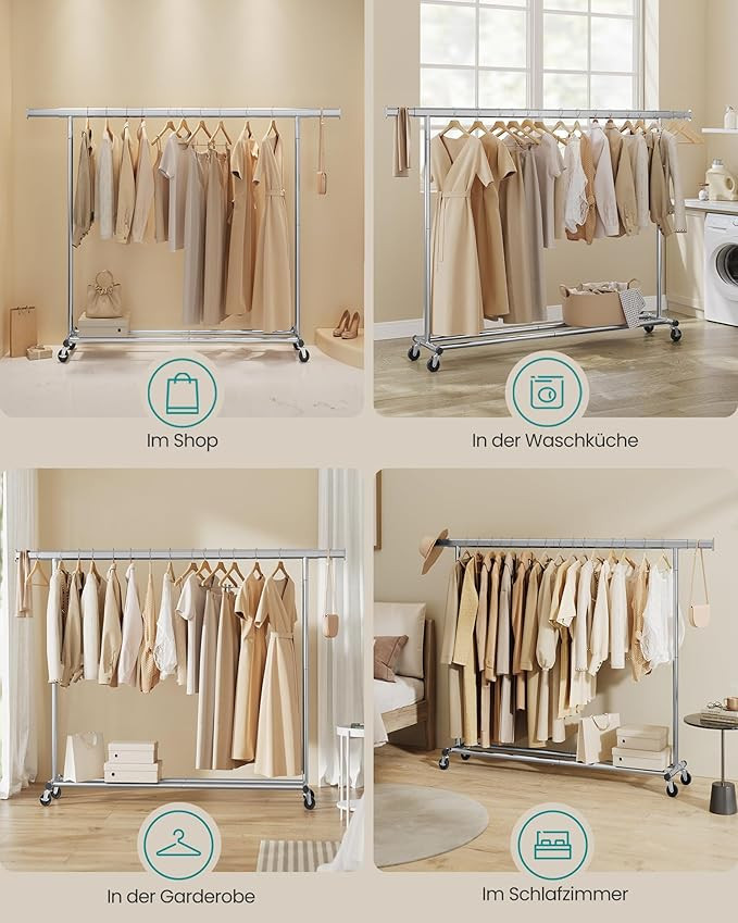 SONGMICS Gurulós Ruhaállvány Nagy Teherbírású Kihúzható Acél Ruhatartó 150kg Ezüst