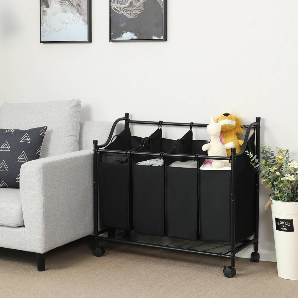 SONGMICS Gurulós Szennyestartó Kocsi 4 Kivehető Zsákkal Fekete