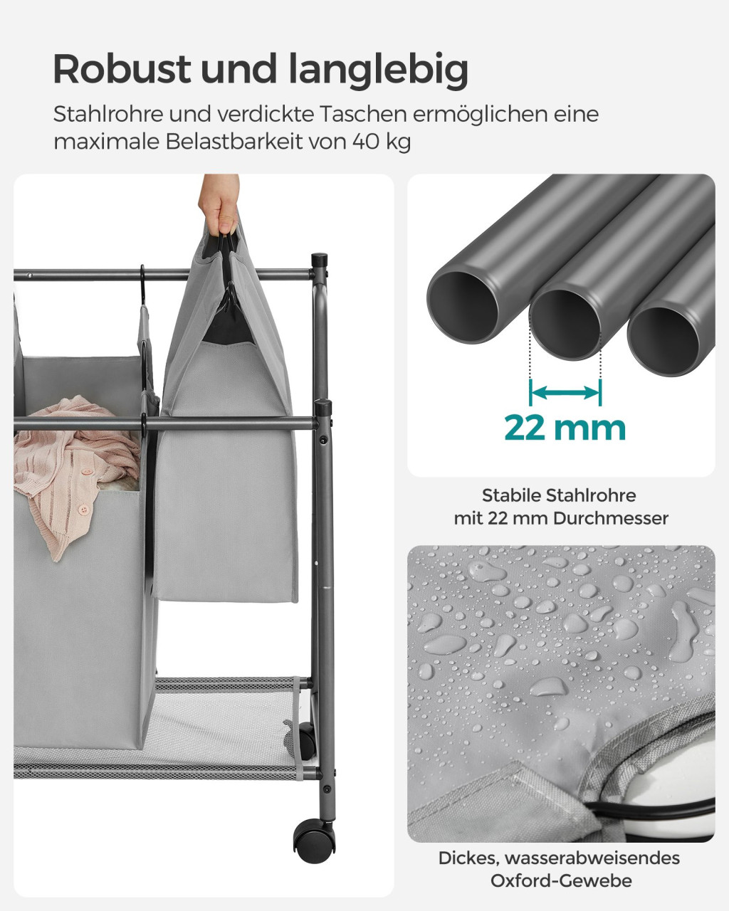 Ez a modern szennyestartó kocsi forradalmasítja a mosási rutint a négy kivehető, vízálló zsákjával. A strapabíró acélvázas szerkezet és a 600D Oxford szövet tartós használatot biztosít, míg a görgős kialakítás könnyű mozgathatóságot tesz lehetővé.