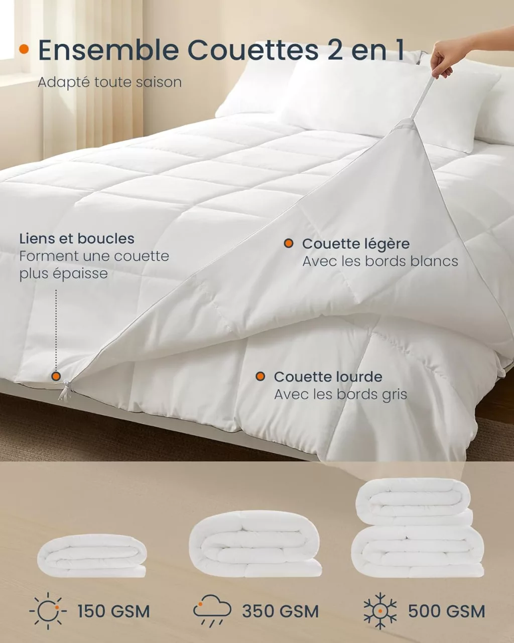 Ez a sokoldalú paplanszett forradalmasítja az alvásélményt a négy évszak során. A 150 GSM könnyű nyári és 350 GSM vastagabb téli paplan külön-külön vagy együtt is használható, így mindig az időjárásnak megfelelő meleget biztosít. A mikroszálas külső borítás és a 7D poliészter töltet optimális légáteresztést és puhaságot garantál.