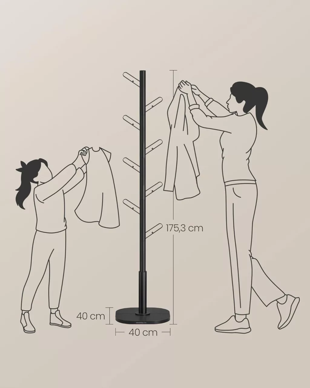 A stabil, 40x40 cm-es talp és a minőségi acél szerkezet garantálja a tartósságot, míg az elegáns fekete kivitel bármilyen enteriőrbe könnyedén beilleszthető. A kampónkénti 5 kg-os teherbírás lehetővé teszi kabátok, táskák és egyéb kiegészítők praktikus tárolását.