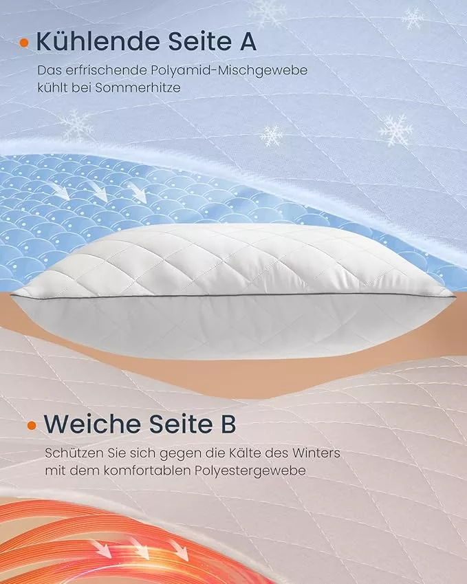 Ez a különleges kétoldalas párna forradalmasítja az alvásélményt az év minden szakában. A nyári oldalon innovatív, hűsítő poliamid keverék szövet gondoskodik a kellemes alvásról a meleg éjszakákon, míg a téli oldal puha poliészter borítása melegen tart a hideg időben.
