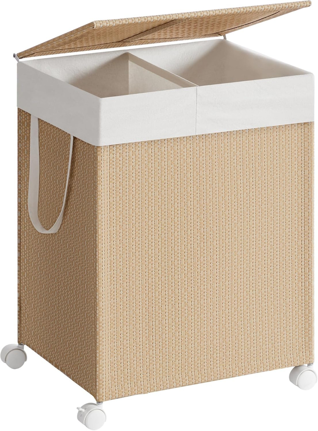 Stílusos, nagy kapacitású szennyestartó kosár két rekesszel, görgőkkel és fedéllel, amely tökéletes megoldást nyújt a családi ruházat rendszerezett tárolására.
