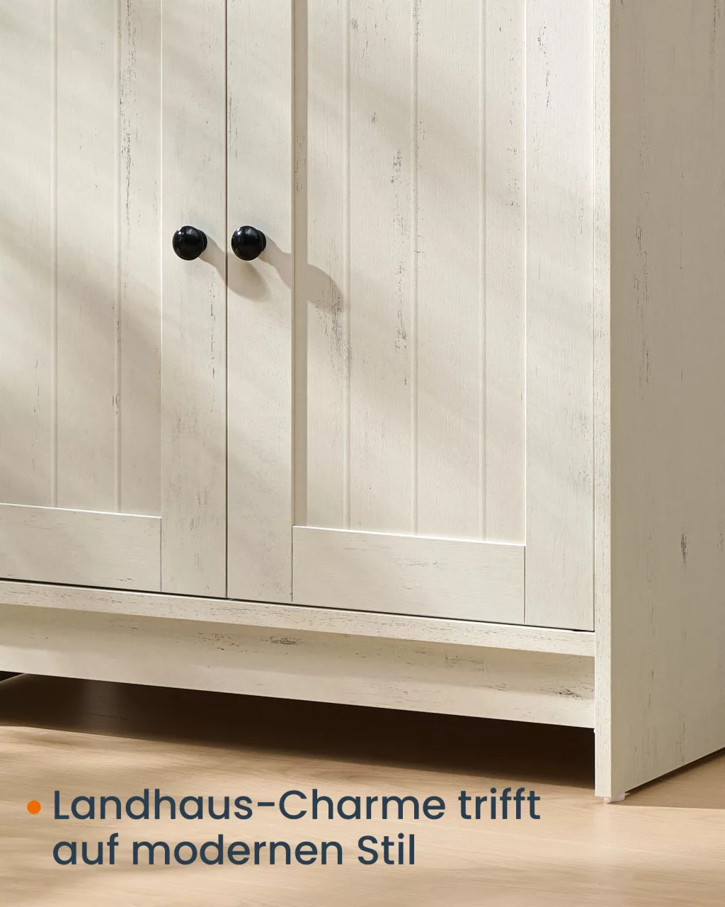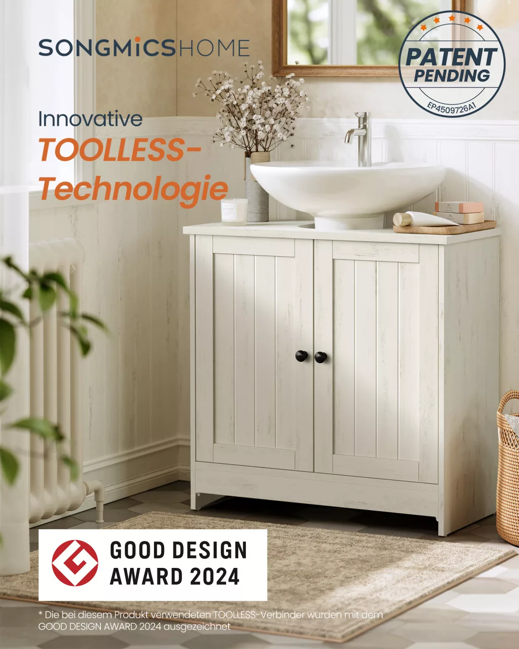 A SONGMICS HOME mosdó alatti szekrény újradefiniálja a bútorok összeszerelését. A GOOD DESIGN AWARD 2024 díjjal elismert innovatív csatlakozórendszernek köszönhetően a panelek egyszerűen összekapcsolhatók szerszámok használata nélkül, így a fárasztó összeszerelés és számtalan rögzítőelem múlté. A rusztikus fehér felület, a lamellás vonalvezetés és a vintage fogantyúk modern farmhouse hangulatot teremtenek, amely otthonossá és meghitté varázsolja fürdőszobáját.