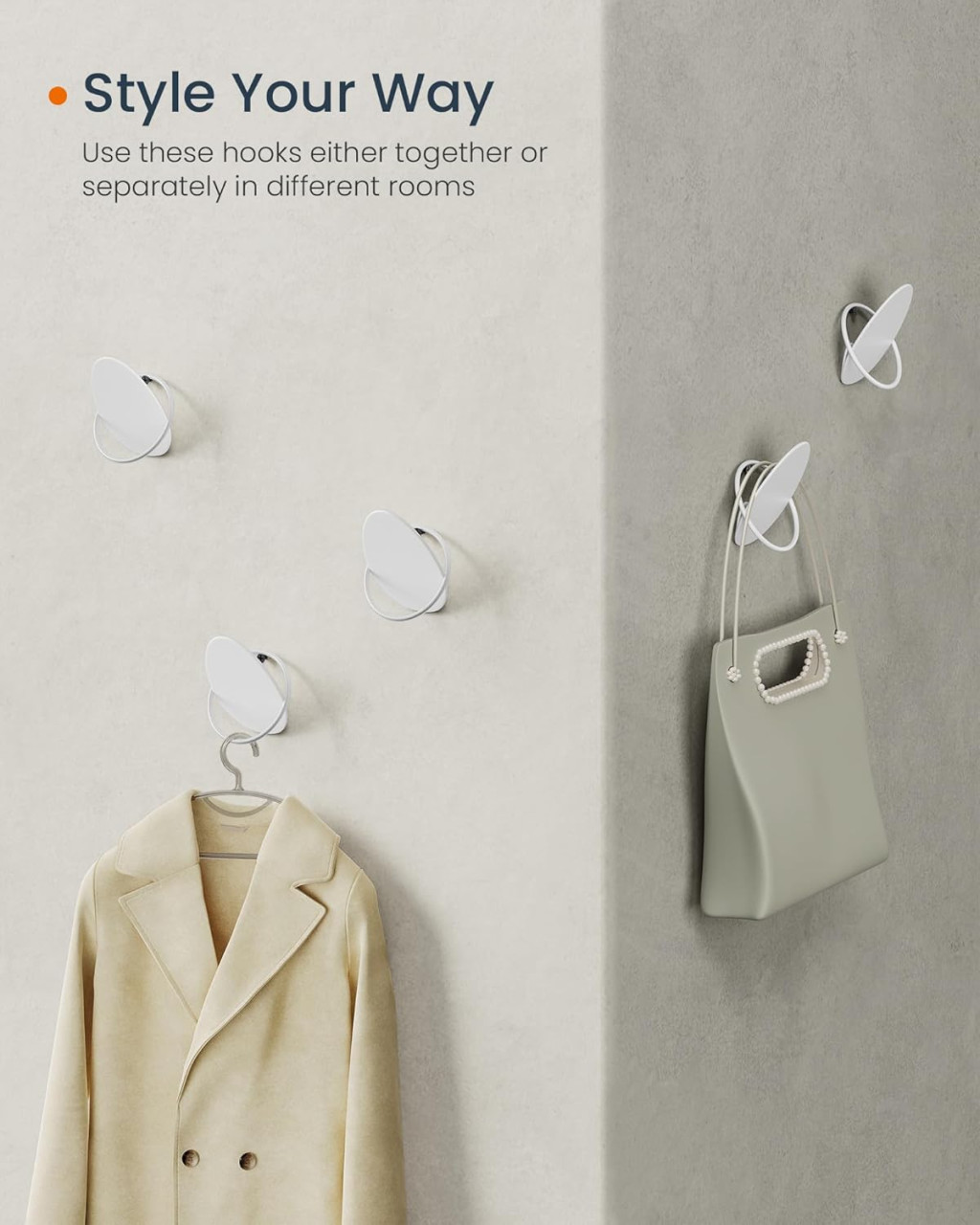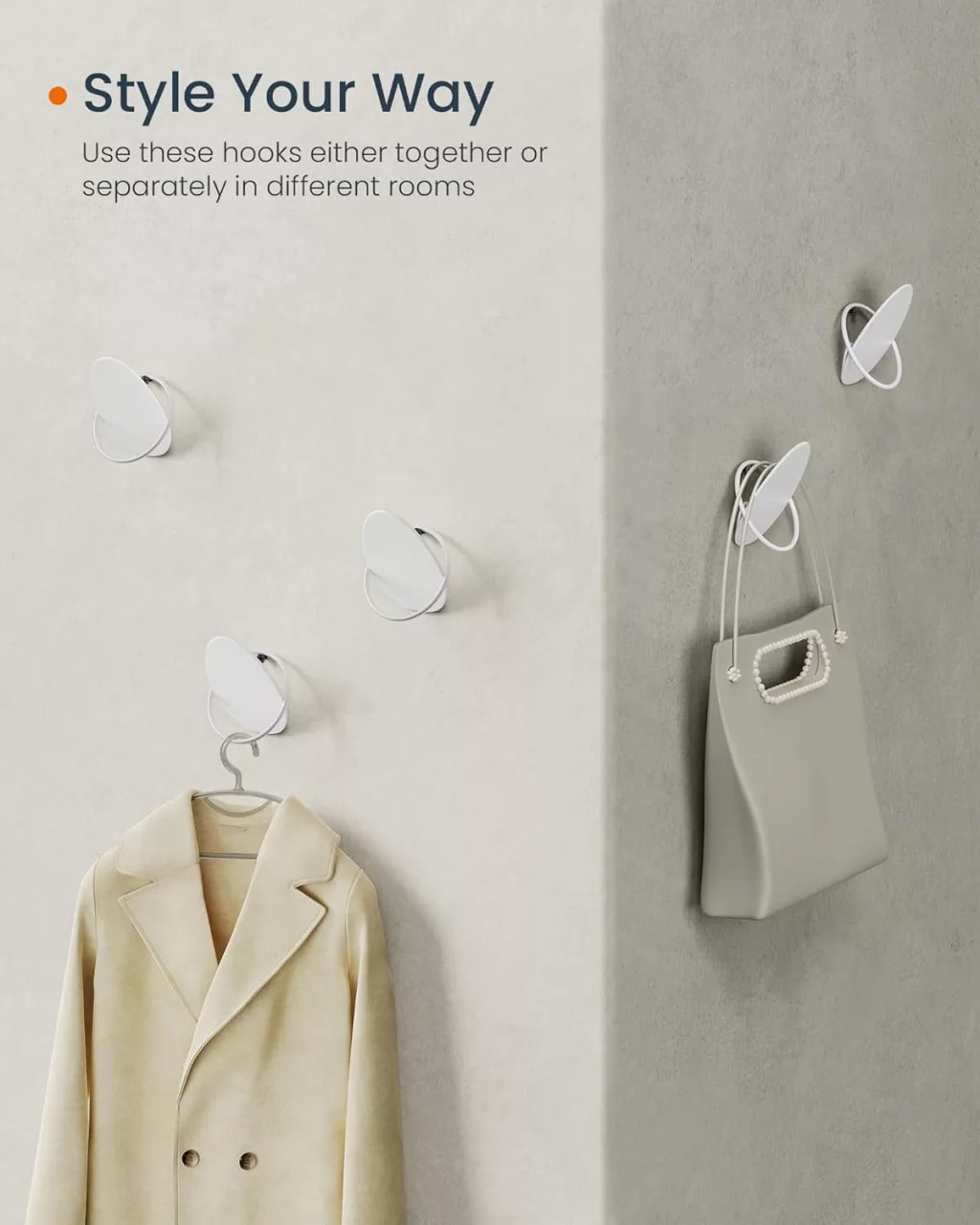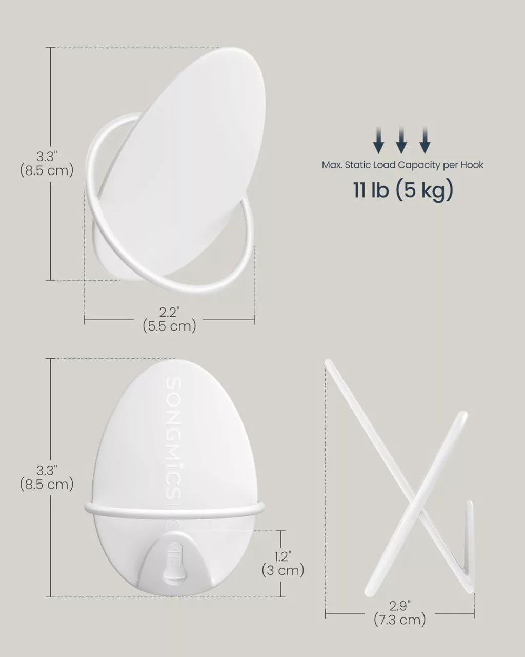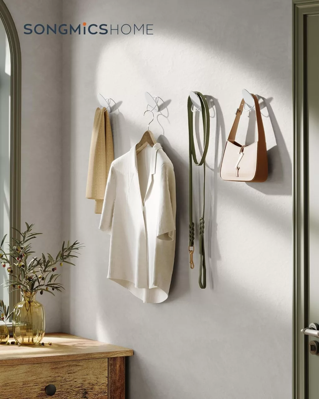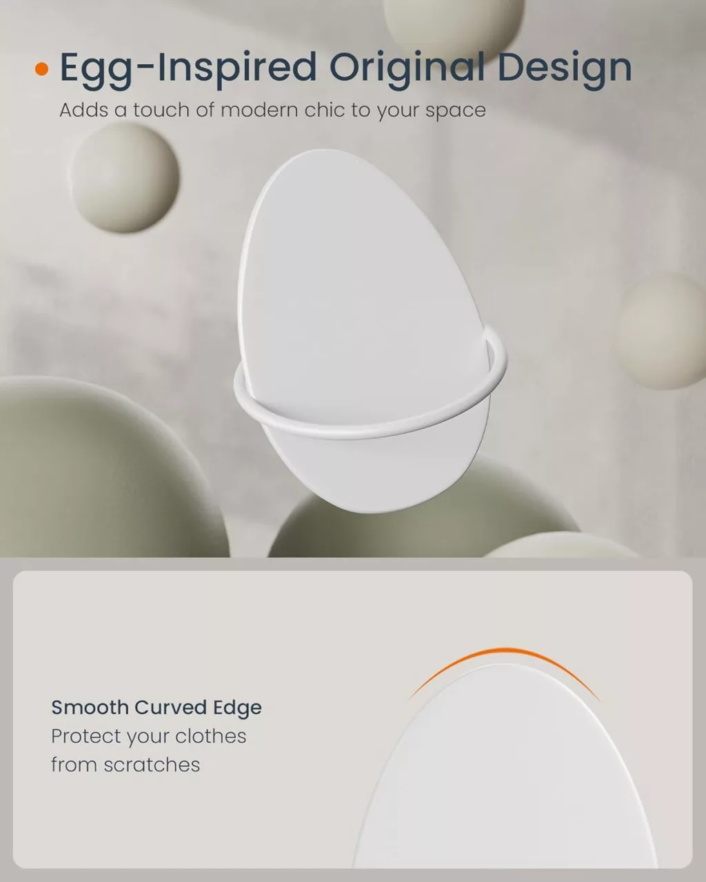 A SONGMICS HOME tojás alakú fali akasztói ötvözik az esztétikumot és funkcionalitást. A minőségi acélból készült, gyöngyház fehér bevonattal ellátott akasztók egyenként 5 kg teherbírással rendelkeznek, így tökéletesen alkalmasak kabátok, táskák és egyéb kiegészítők tárolására.