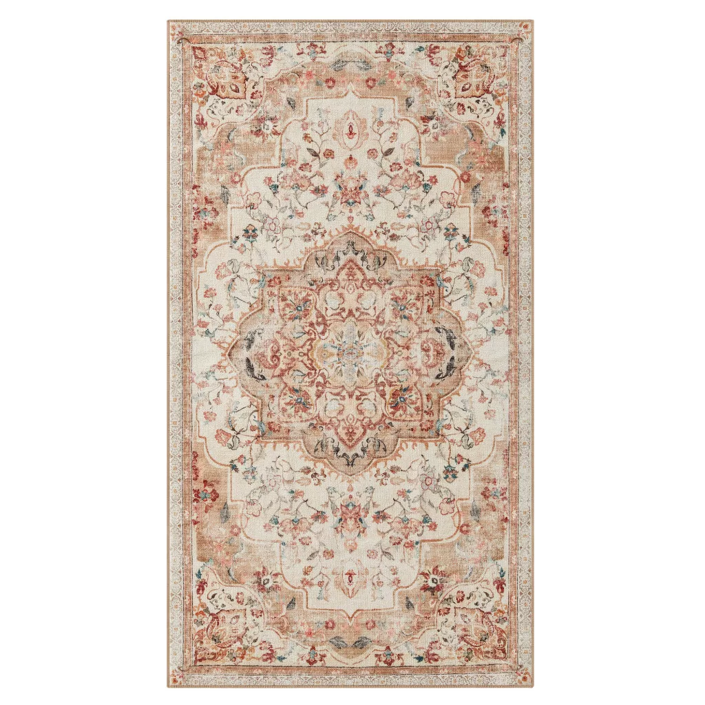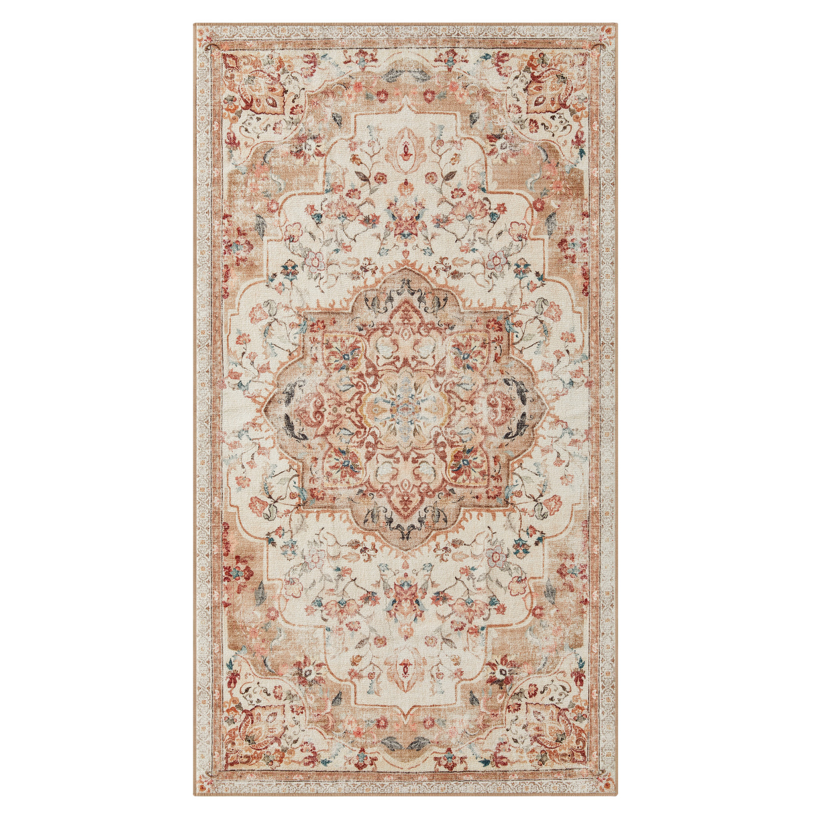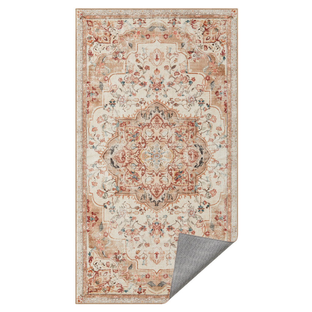 Elegáns vintage mintázatú szőnyeg puha poliészter szálakkal és csúszásmentes hátoldallal, amely tökéletes választás nappalikba és előszobákba.