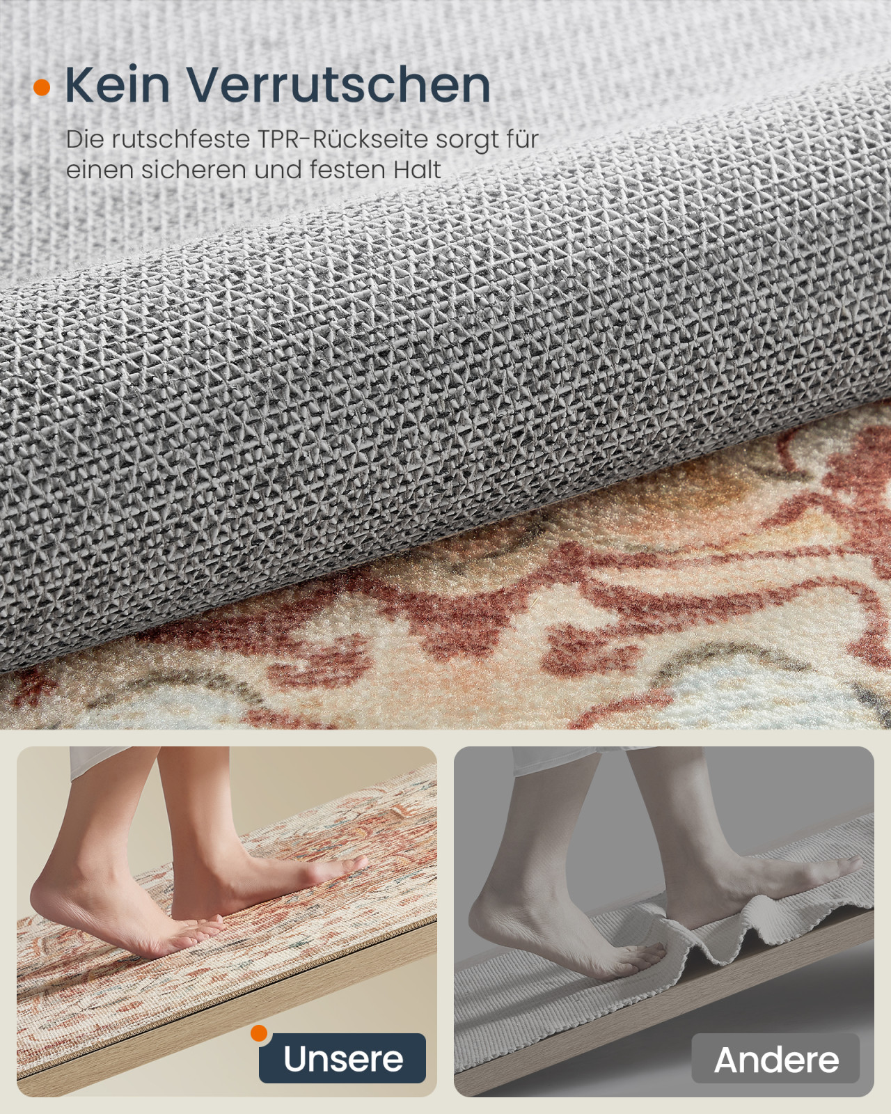 A szőnyeg különlegesen puha poliészter szálakból készült, vastag filc köztes réteggel, amely kellemes puhaságot biztosít minden lépésnél. A csúszásmentes TPR hátoldal biztonságos használatot garantál minden padlótípuson.