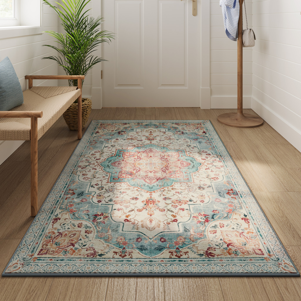 Elegáns, vintage stílusú szőnyeg türkiz és korall mintázattal, amely tökéletes kényelmet és stílust biztosít otthonának bármely helyiségében.