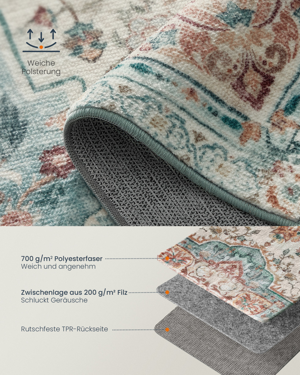 A kiváló minőségű poliészter szálak és a filc köztes réteg páratlan puhaságot biztosít, miközben a csúszásgátló TPR alap gondoskodik a biztonságos használatról. A szőnyeg könnyen tisztítható és géppel mosható, így hosszú távon is megőrzi szépségét.