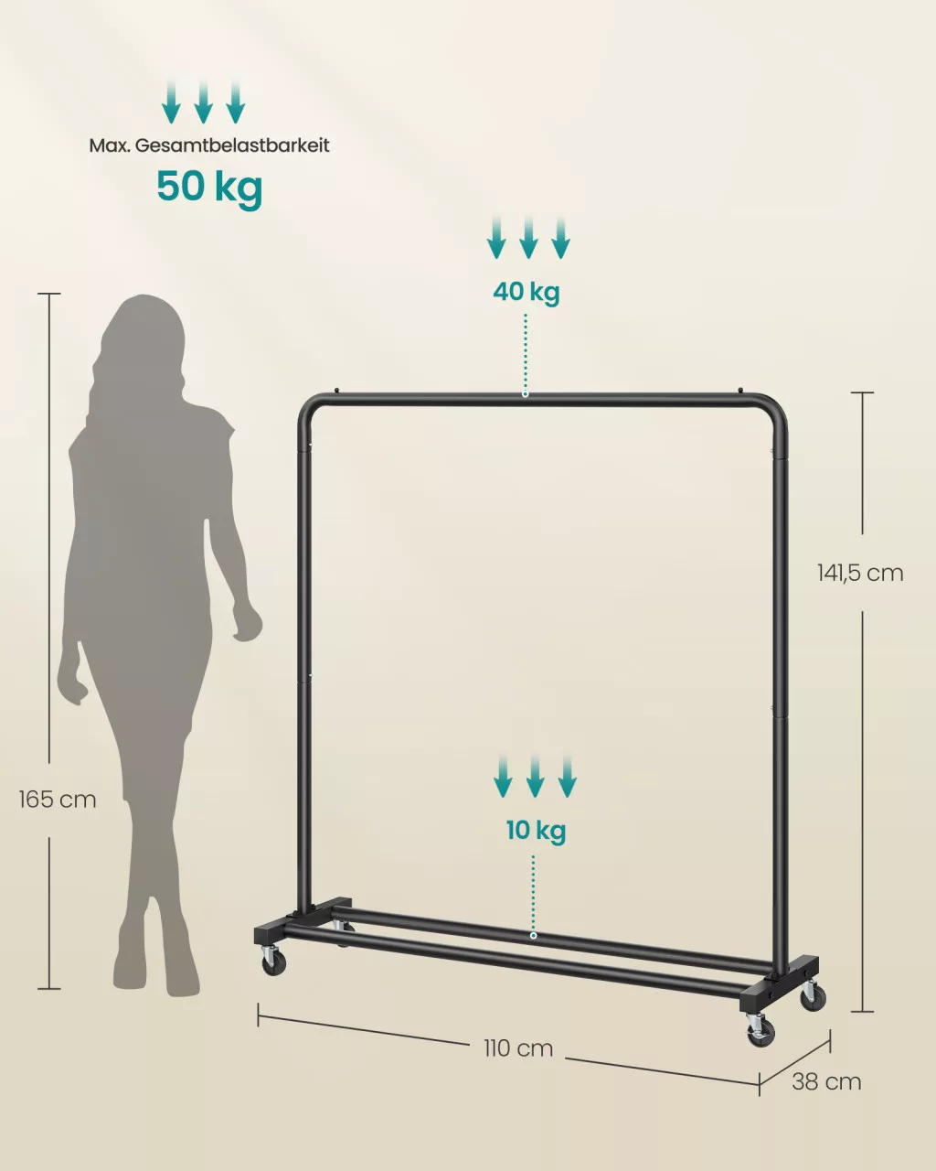 A SONGMICS mobil ruhaállvány a tökéletes megoldás azok számára, akik extra tárolóhelyet keresnek ruháik számára. A prémium minőségű acélból készült állvány 50 kg összteherbírással rendelkezik, így akár nehéz téli kabátokat is magabiztosan tárolhat rajta. A 110 cm széles rúd bőséges helyet biztosít kabátok, ruhák, nadrágok és egyéb ruhadarabok számára, míg az alsó polc ideális cipők, tárolódobozok vagy kosarak elhelyezésére.