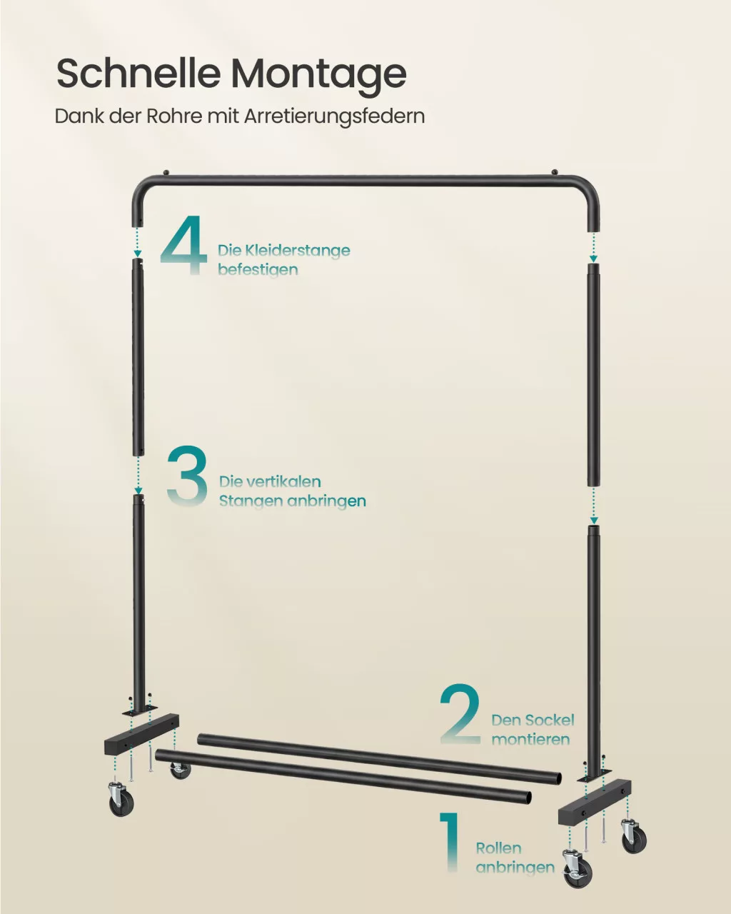 A négy 360°-ban forgó kerék lehetővé teszi, hogy könnyedén mozgassa az állványt szobáról szobára, míg a két zárható kerék biztonságosan rögzíti a kívánt helyen. Az ipari minőségű kerekek tartósabbak és erősebbek a hagyományos kerékeknél. Legyen szó hálószobáról, öltözőről, mosókonyháról vagy előtérről, ez a ruhaállvány extra tárolóhelyet biztosít és segít rendben tartani otthonát. Az összeszerelés gyerekjáték a mellékelt szerszámokkal, számozott alkatrészekkel és részletes útmutatóval.