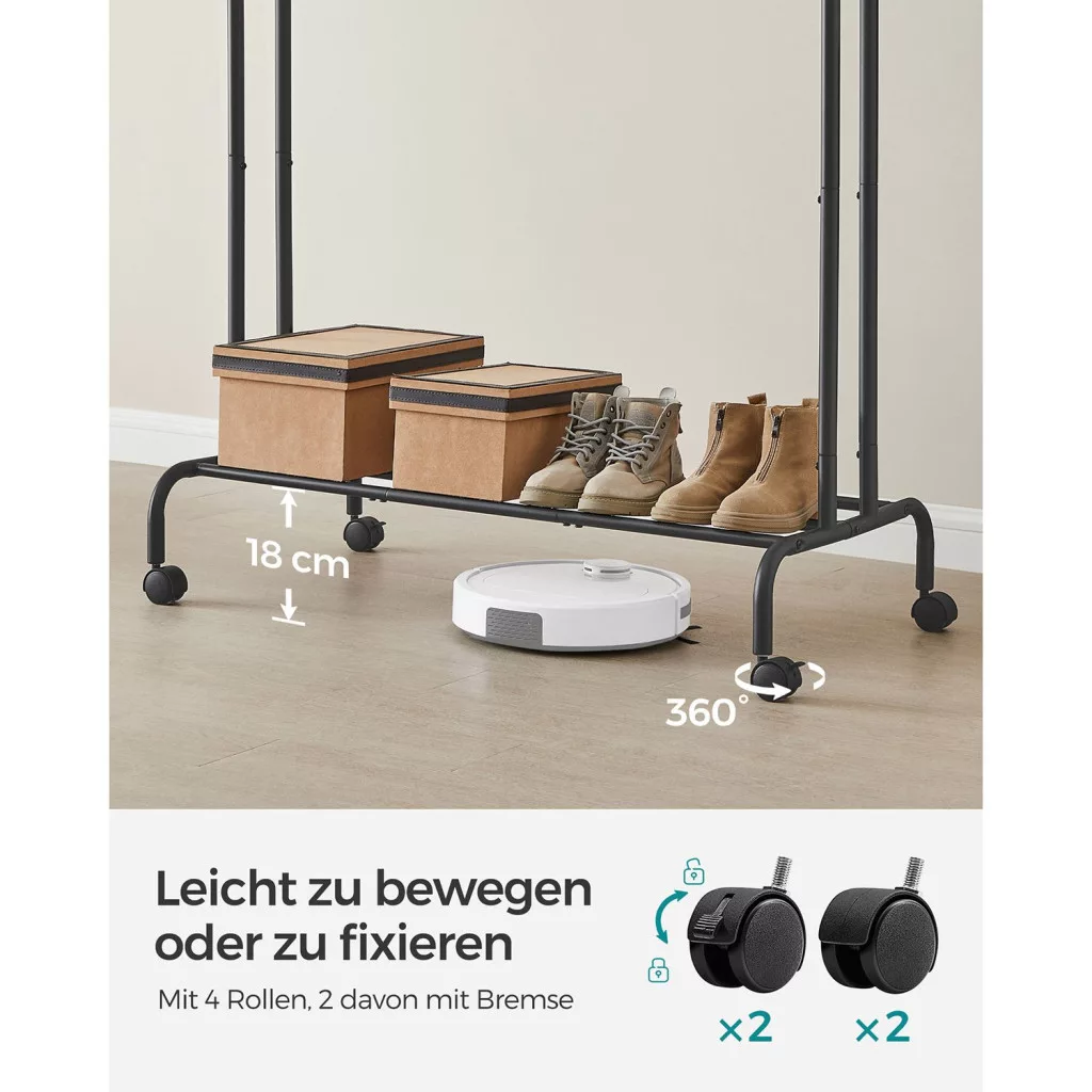 A SONGMICS dupla ruhásállvány a tökéletes megoldás azok számára, akik praktikus és mozgatható tárolást keresnek ruháiknak. A két különböző magasságú rúd lehetővé teszi hosszú és rövid ruhadarabok egyidejű tárolását, míg az oldalsó kampók táskák és kalapok akasztására szolgálnak. Az alsó polc további tárolóhelyet biztosít cipőknek, dobozoknak vagy kosárknak. A strapabíró fém szerkezet 100 kg összsúlyt bír el, így akár a teljes szezonális gardróbod is elfér rajta.