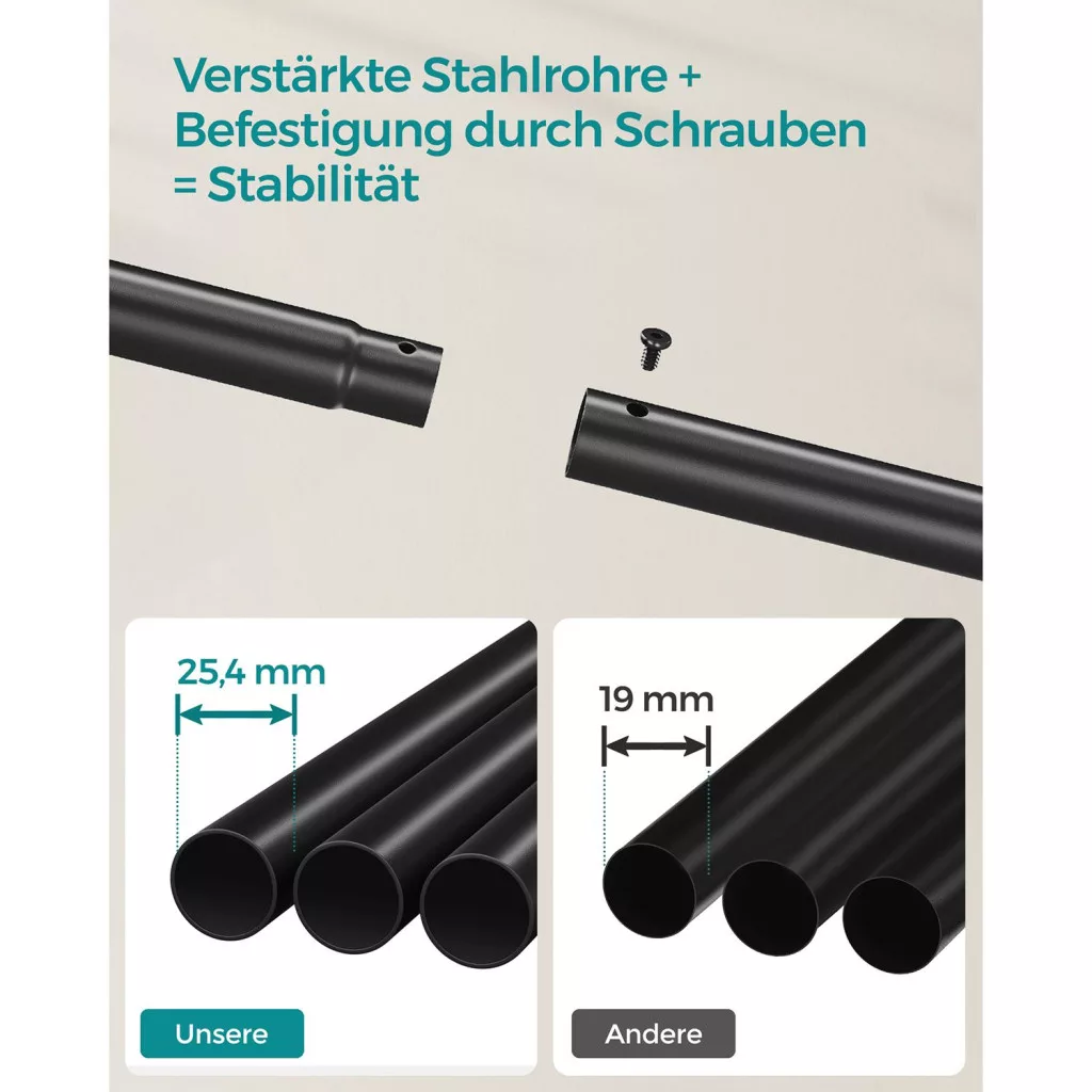 • 100 kg teherbírás: A masszív 25,4 mm átmérőjű acélcsövekből készült szerkezet rendkívüli stabilitást és tartósságot biztosít, így akár nehezebb téli kabátokat is nyugodtan tárolhatsz rajta.
