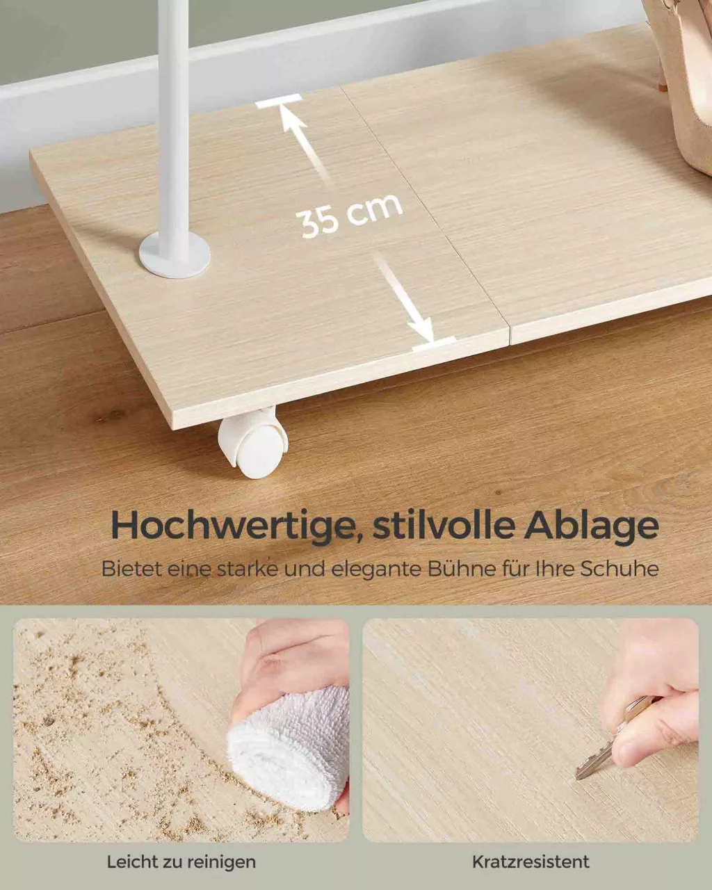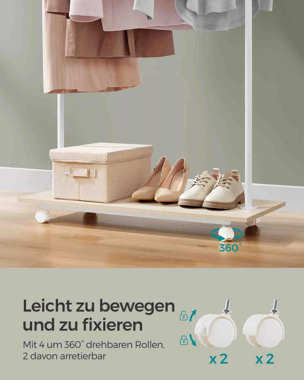 A négy 360°-ban elforduló kerék, melyből kettő fékezhető, könnyű mozgathatóságot biztosít, az alsó polc pedig praktikus tárolóhelyet kínál cipőknek és dobozoknak. Az erős acélszerkezet és a minőségi forgácslapból készült polc garantálja a tartósságot és a stabilitást.