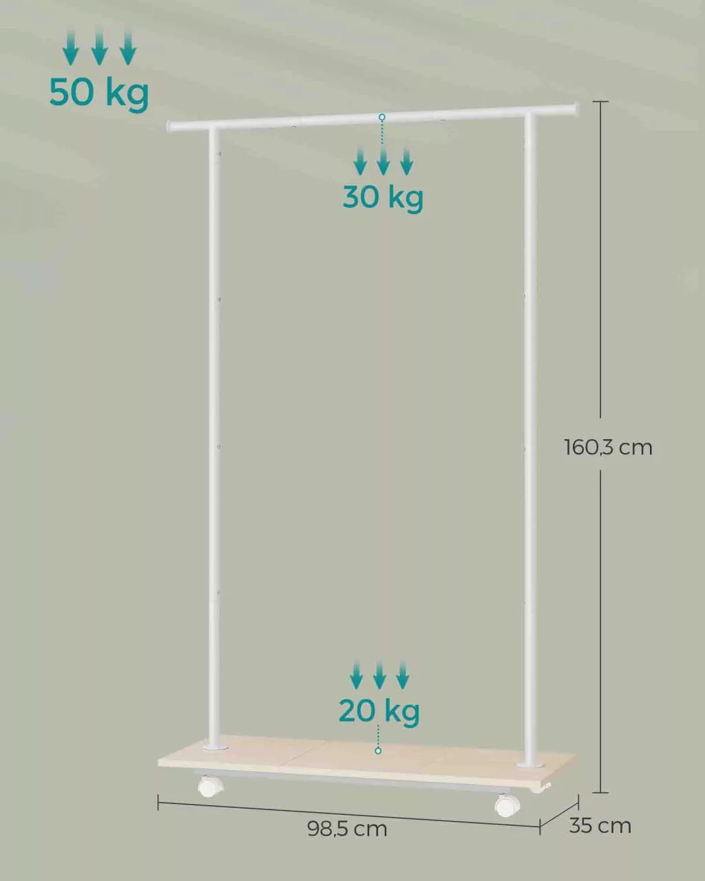 • Nagy teherbírás: 30 kg az akasztórúdon és 20 kg a polcon