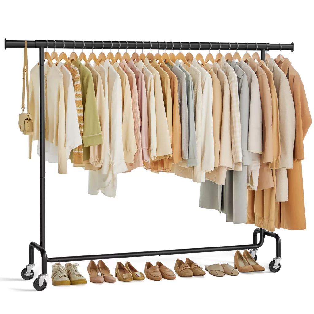 Professzionális minőségű, bővíthető ruhaállvány 110 kg teherbírással, amely praktikus tárolási megoldást kínál otthonában. A matt fekete kivitel és a gurulós kialakítás modern megjelenést és könnyű mozgathatóságot biztosít.
