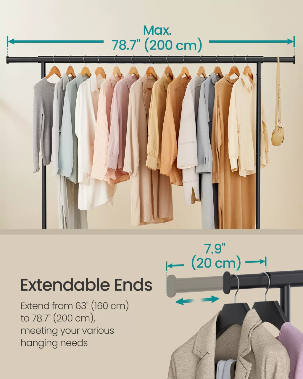 A SONGMICS HSR176B01 ruhaállvány a minőség és funkcionalitás tökéletes ötvözete. Az 1 mm vastag acélcsöveknek köszönhetően ez a ruhaállvány akár 110 kg terhelést is elbír, így bátran elhelyezheti rajta nehéz télikabátjait is. A felső rúd 160 cm-ről 200 cm-re bővíthető, így még több hely áll rendelkezésére ruháinak tárolására, míg a végeken kialakított bővítések ideálisak táskák, kalapok és sálak akasztására.