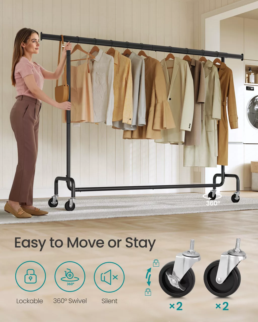 A négy 360°-ban forgatható kerék, amelyből kettő rögzíthető, lehetővé teszi a ruhaállvány könnyű mozgatását a hálószobából a gardróbba vagy a mosókonyhába. Az alsó rúd melletti tér tökéletes cipők tárolására, így minden egy helyen lehet. A szerszám nélküli, háromszakaszos összeszerelés gyors és egyszerű, míg a krómbevonatú acél anyag akár kültéri használatra is alkalmas. Modern matt fekete színével bármilyen lakberendezési stílushoz illeszkedik.