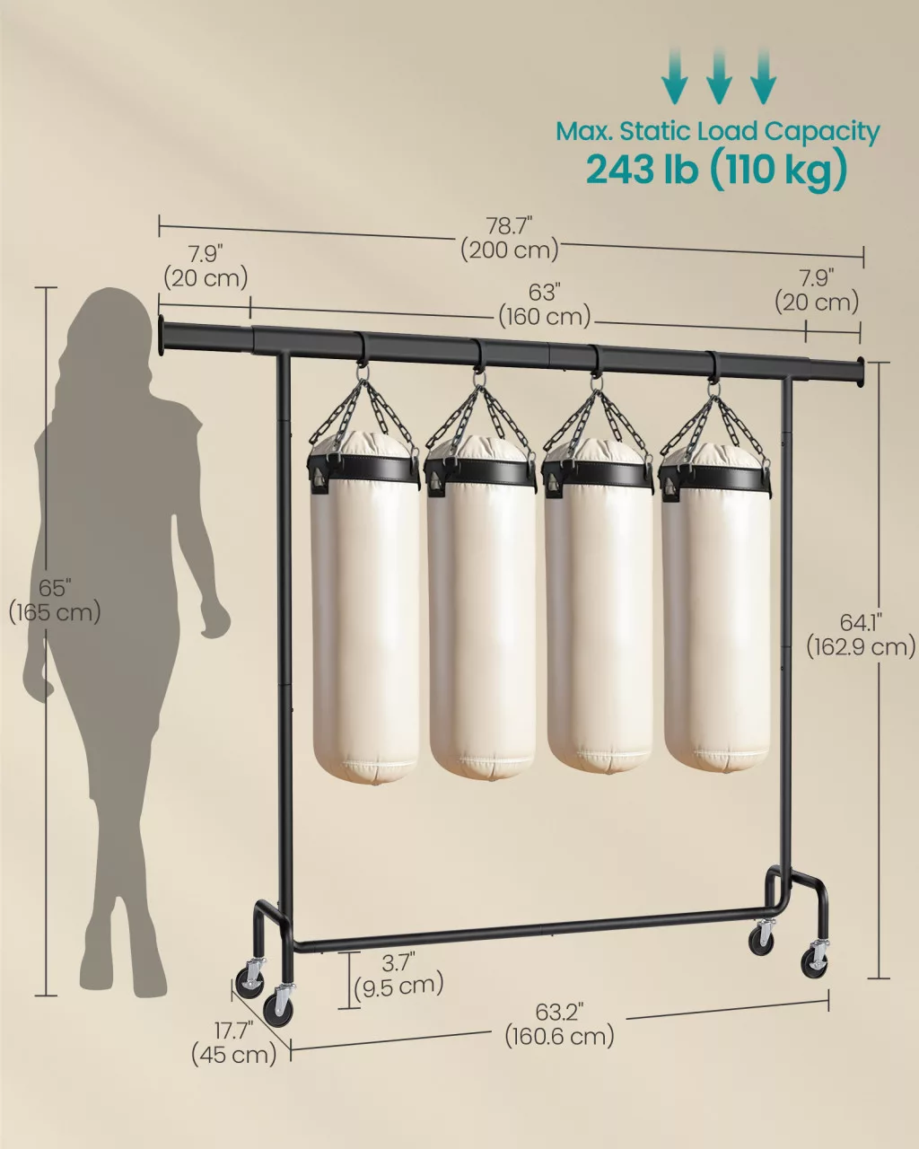 • Kiváló 110 kg teherbírás: Az 1 mm vastag, megerősített acélcsövek és a nagy teherbírású görgők biztosítják, hogy akár nehéz télikabátokat is problémamentesen tárolhasson