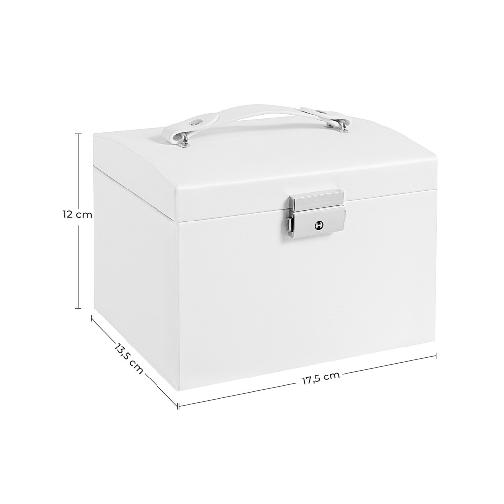 Ez a modern kialakítású, fehér ékszertartó doboz tökéletes kombinációja az eleganciának és funkcionalitásnak. A három szintes kialakítás, valamint a két tágas fiók bőséges helyet biztosít minden ékszer típushoz, míg a beépített tükör lehetővé teszi az azonnali próbát.