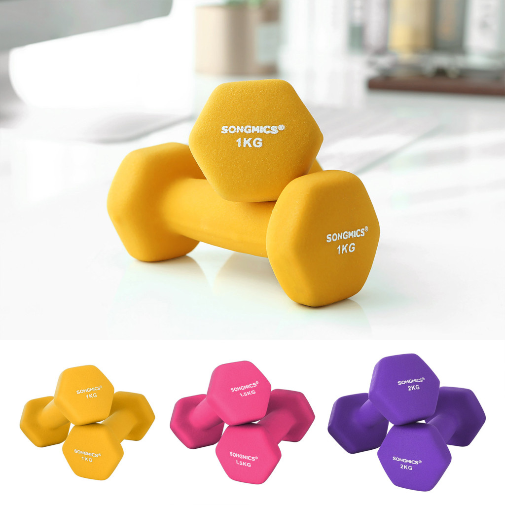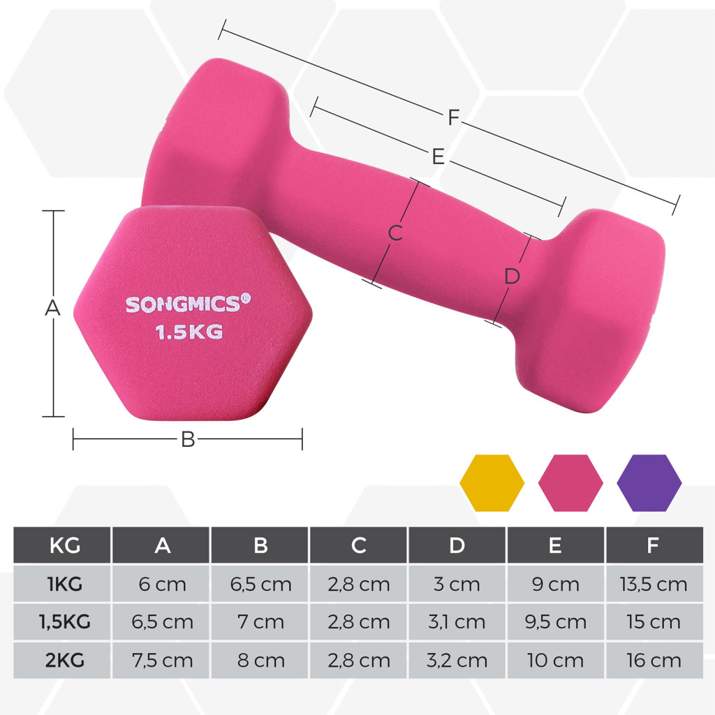 SONGMICS Hatszögletű Súlyzókészlet Állvánnyal Neoprén Bevonattal Sárga-Rózsaszín-Lila