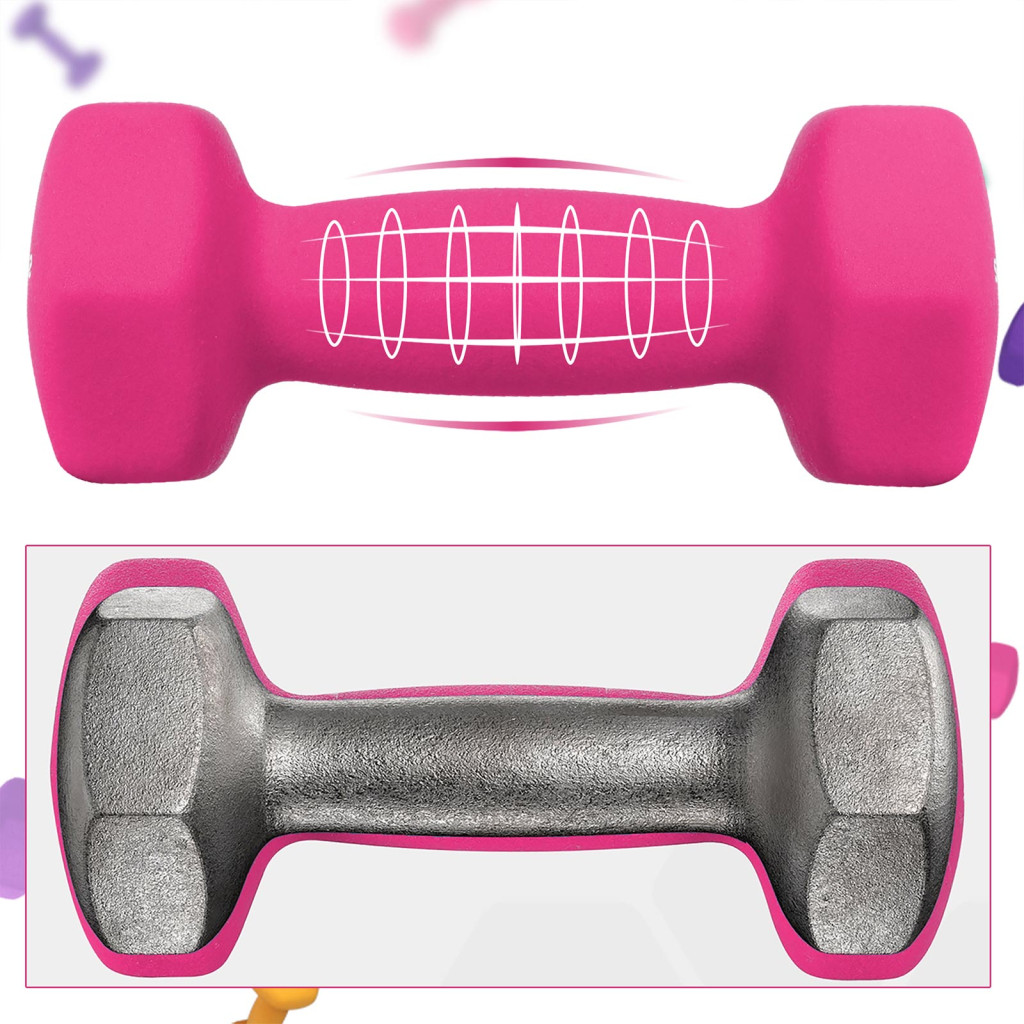 Komplett otthoni edzőkészlet 6 db színes, neoprén bevonatú súlyzóval (2x1 kg, 2x1,5 kg, 2x2 kg) és praktikus állvánnyal az egyszerű tároláshoz.