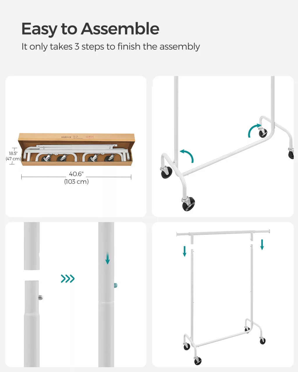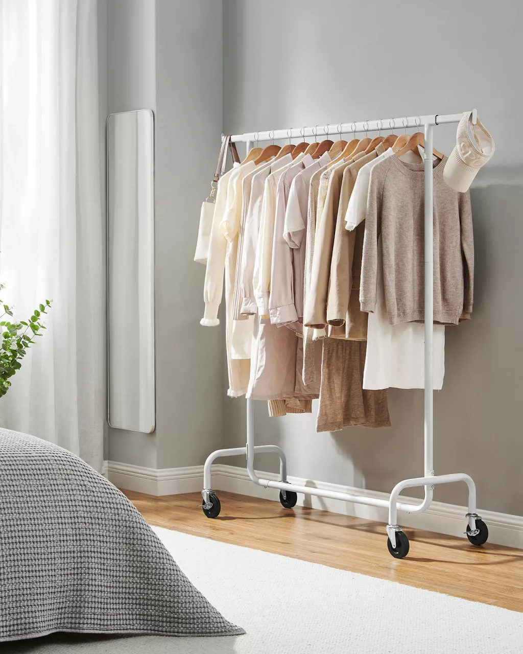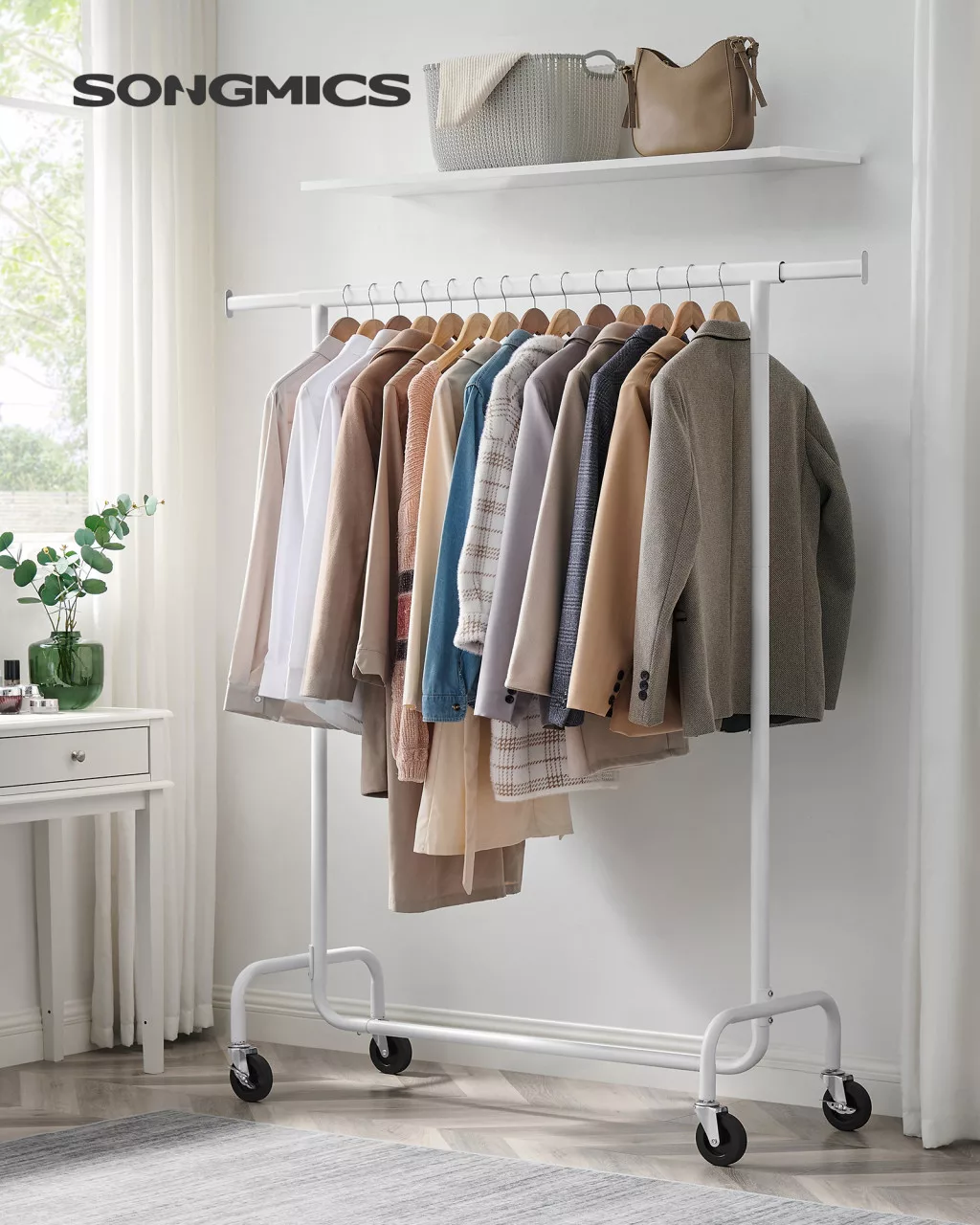 SONGMICS Heavy-Duty Ruhásállvány Kerekekkel Kihúzható Rúddal Acél Matt Fehér 130 kg Teherbírás