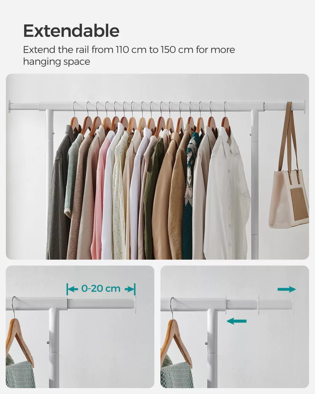 A kihúzható felső rúd 110 cm-ről 150 cm-re bővíthető, így igény szerint növelheti a tároló kapacitást. A rúd végein található kihúzható részek ideálisak kézitáskák, kalapok, sálak és egyéb kiegészítők tárolására. A négy 360°-ban forgatható kerék, amelyből kettő fékezhető, lehetővé teszi a könnyű mozgatást és biztonságos rögzítést. Az alsó rúd melletti tér tökéletes cipők tárolására, így komplett öltözködési állomást hozhat létre.