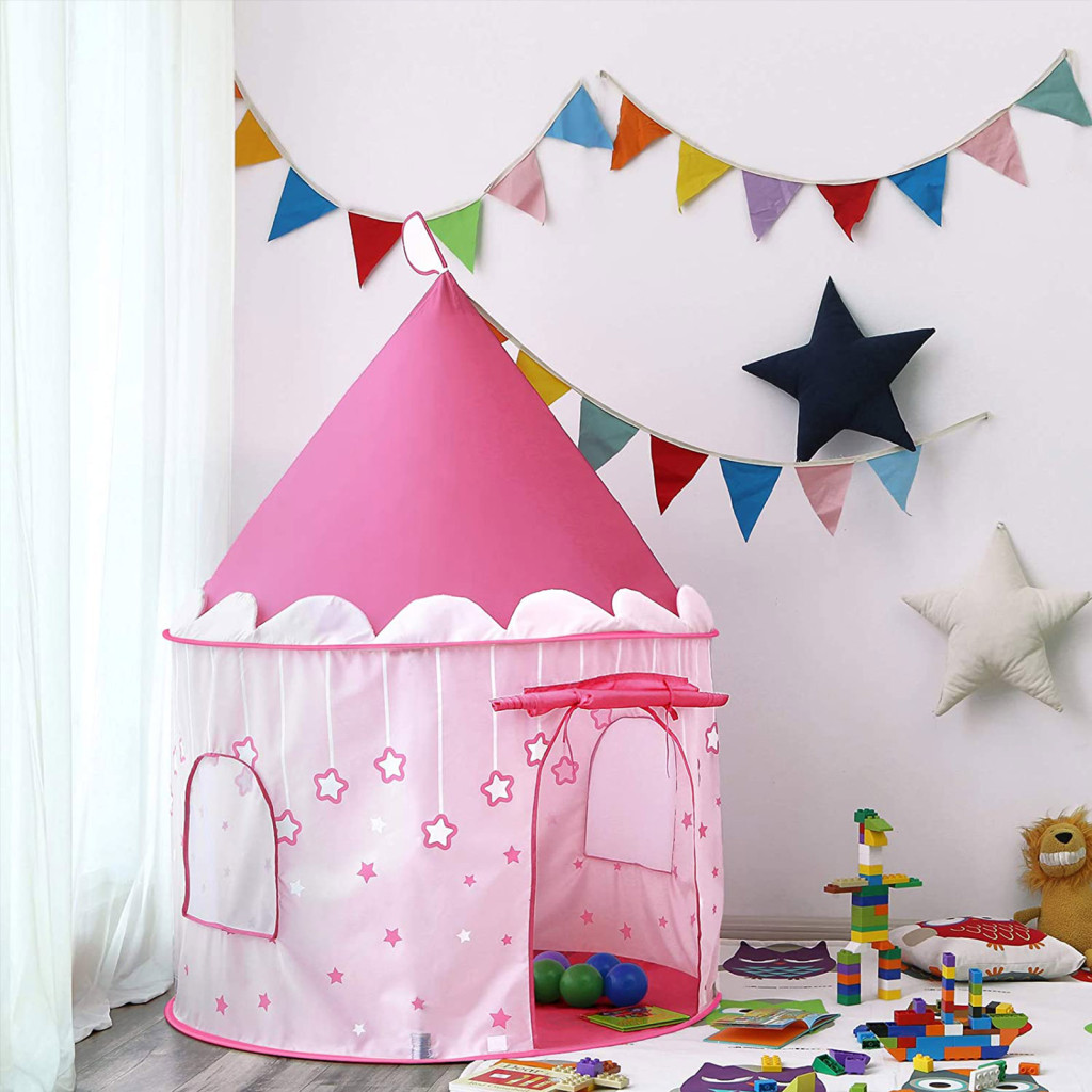 Ez a bájos hercegnői kastély sátor tökéletes menedéket nyújt a kis álmodozóknak. A 101 cm átmérőjű és 135 cm magas rózsaszín játszósátor könnyen összeállítható, és sötétben világító csillagokkal van díszítve, ami extra varázslatos hangulatot teremt.